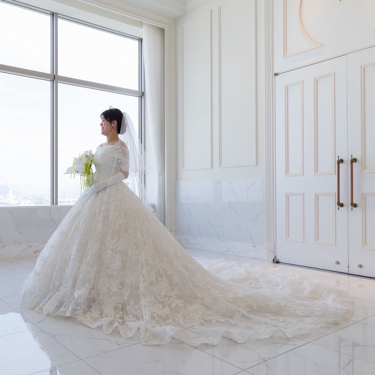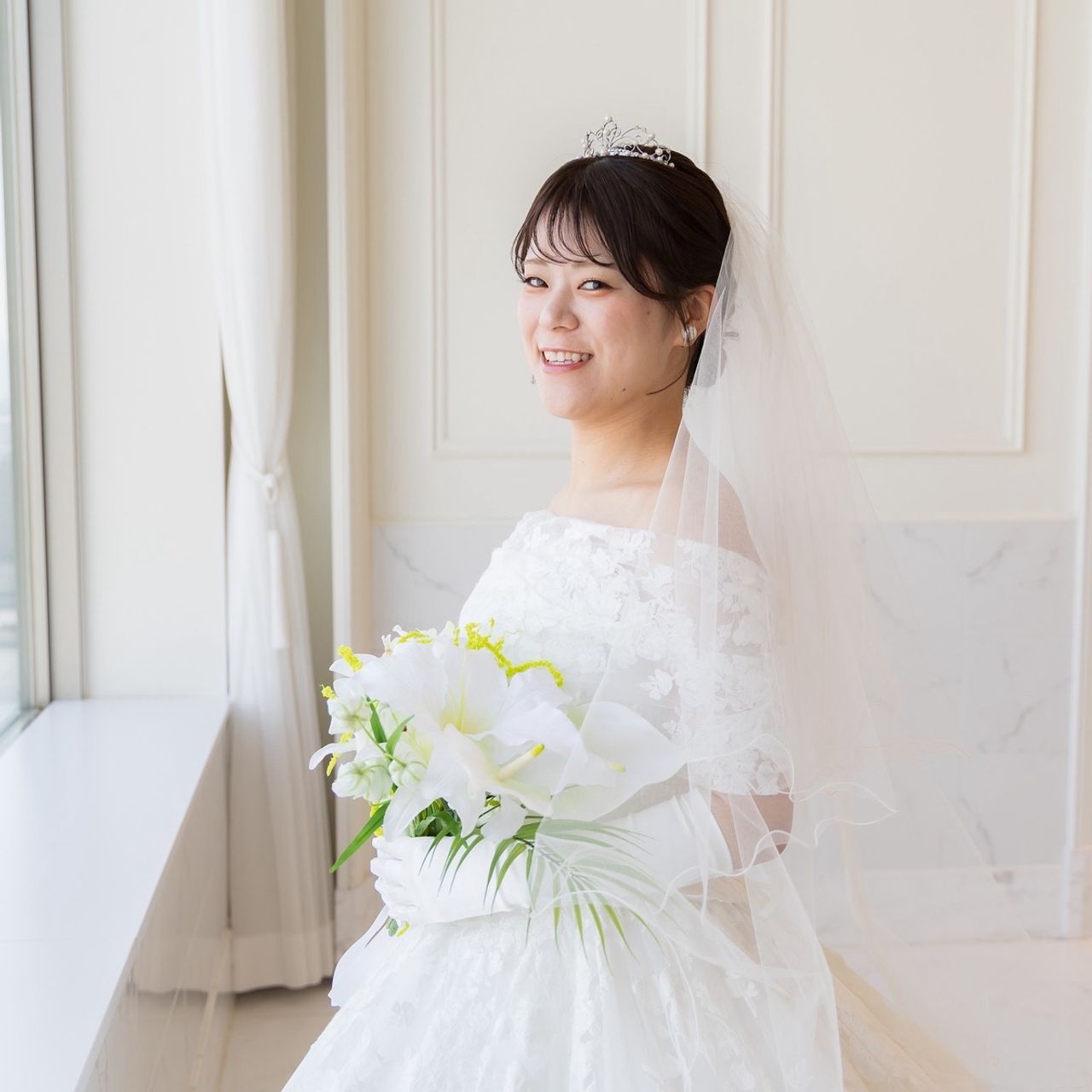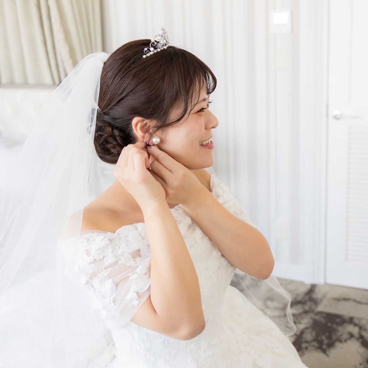 ウェディングドレスには、アクセサリーに合わせてパールのティアラをつけました。
