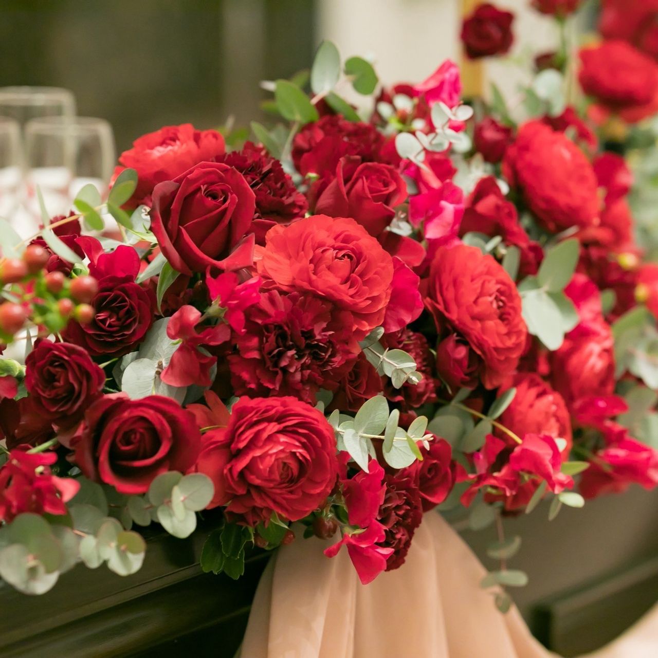 テーブルクロスと色を合わせて統一感を出しました。装花は、バラをメインとした赤色のお花を使って、バレンタインのような雰囲気でお願いしています。