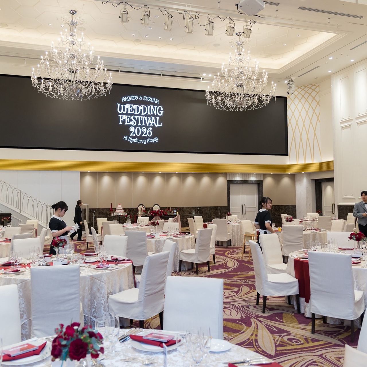 すごく綺麗な会場で、途中でカーテンがゆっくりと上がり、景色が綺麗に見えます。高い場所にある会場なので、遠くまで空が続いて見えるところも素敵でした。