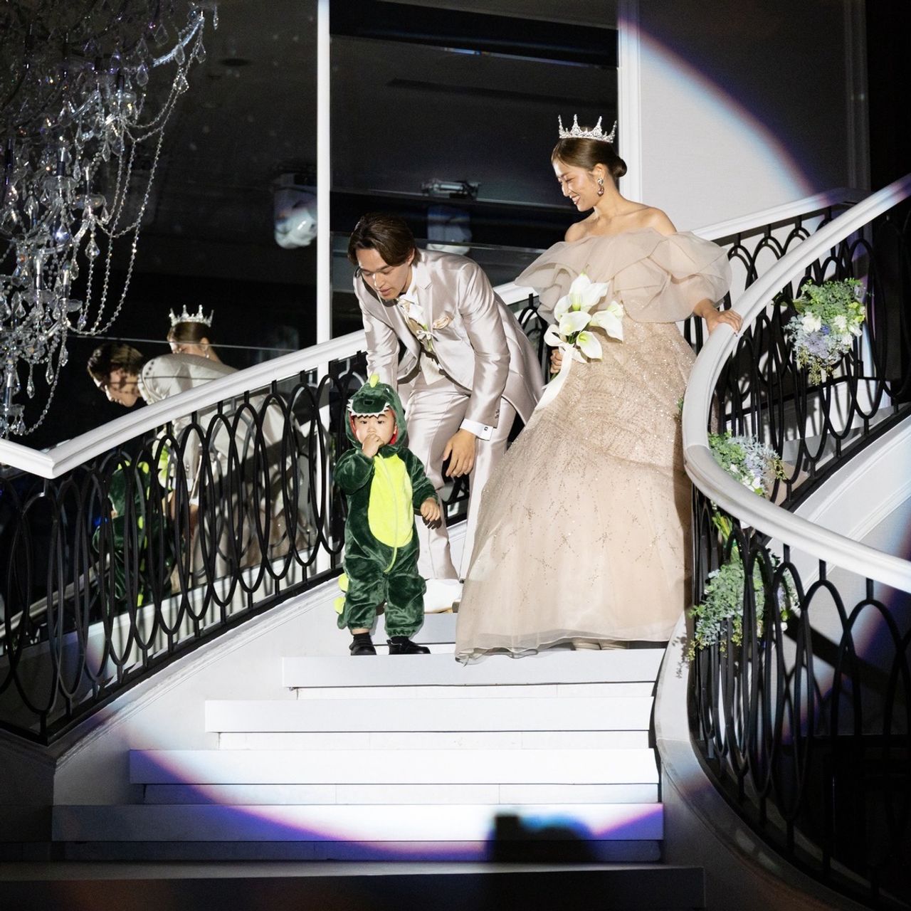 お色直し後は、恐竜に変身した子どもと一緒に、家族3人で階段から入場しました。ゲストからも「可愛い!」と声をかけてもらえて、私たちらしい温かい入場シーンになったと思います。