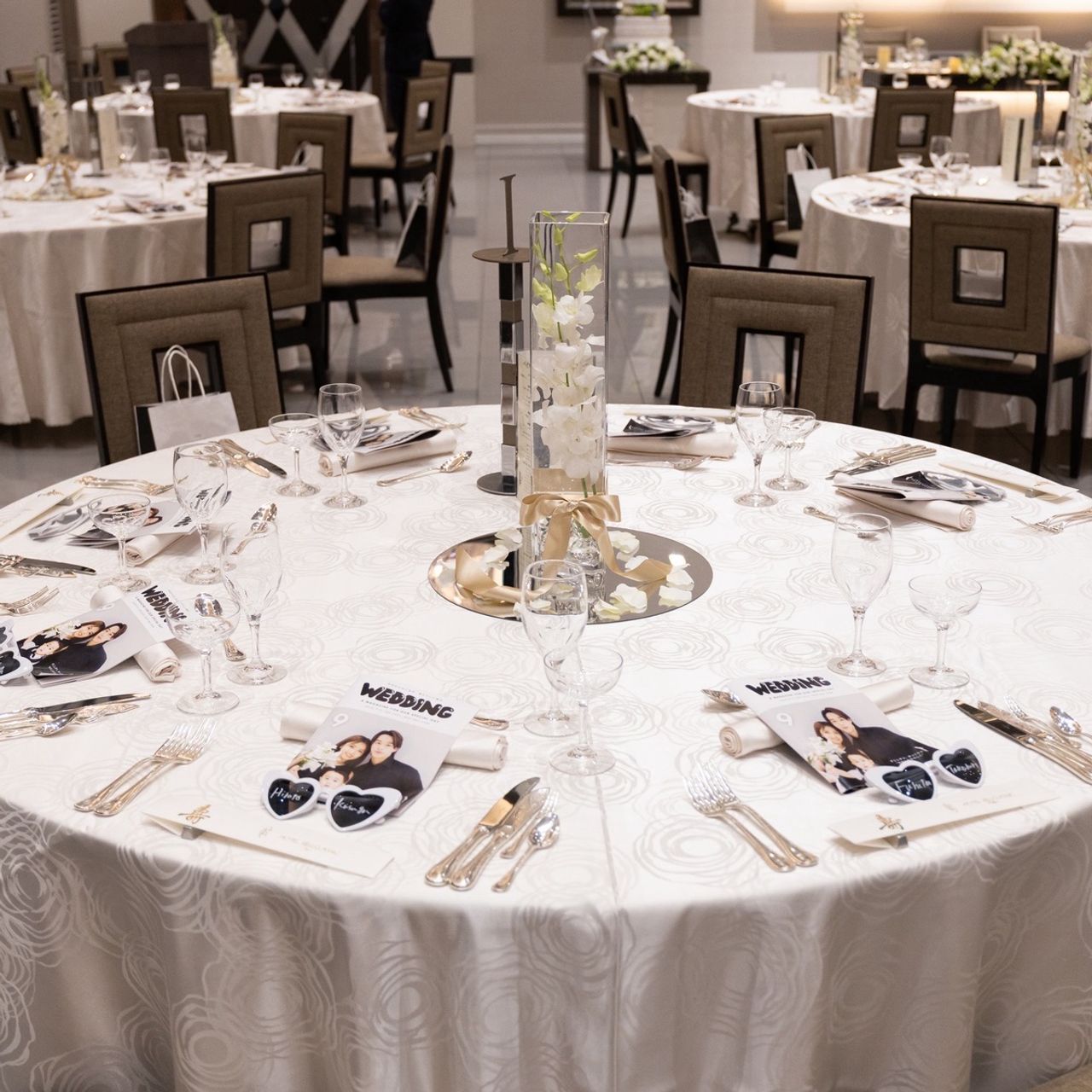 会場は白を基調に、黒と金をアクセントにしたクラシカルな空間にしています。自宅インテリアでもニュートラルカラーが好きなので、私たちらしい雰囲気を表現しました。
