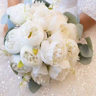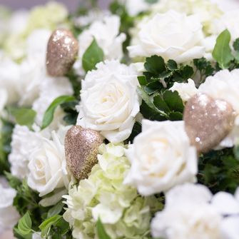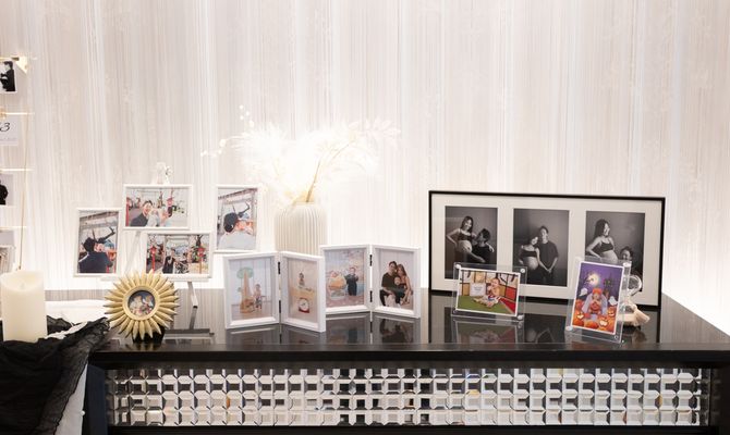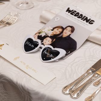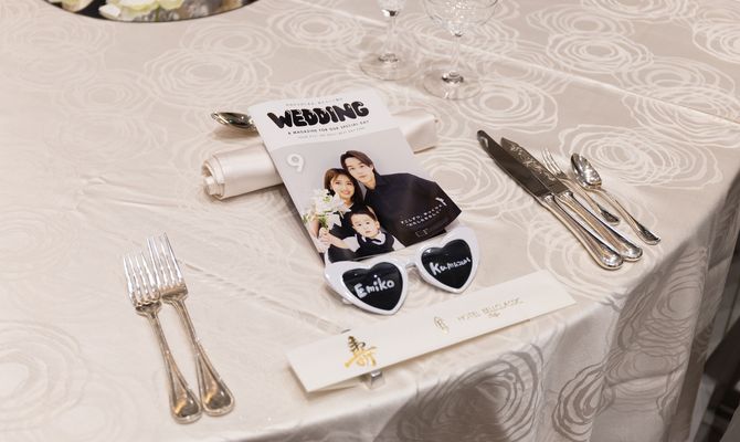 会場は白を基調に、黒と金をアクセントにしたクラシカルな空間にしています。自宅インテリアでもニュートラルカラーが好きなので、私たちらしい雰囲気を表現しました。