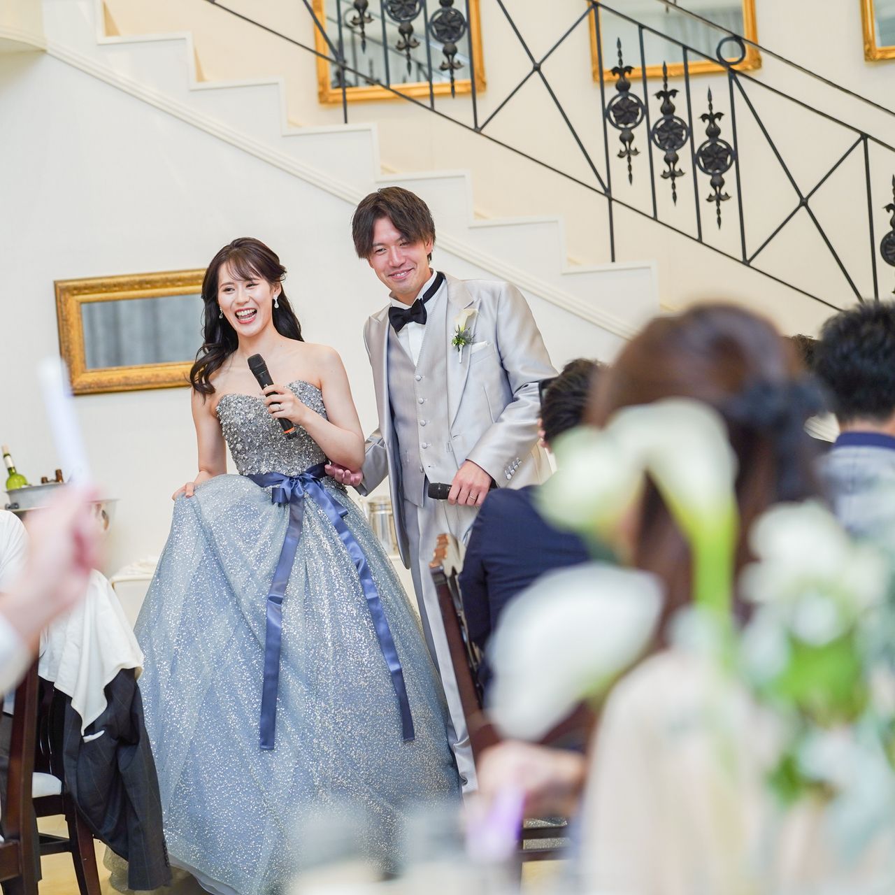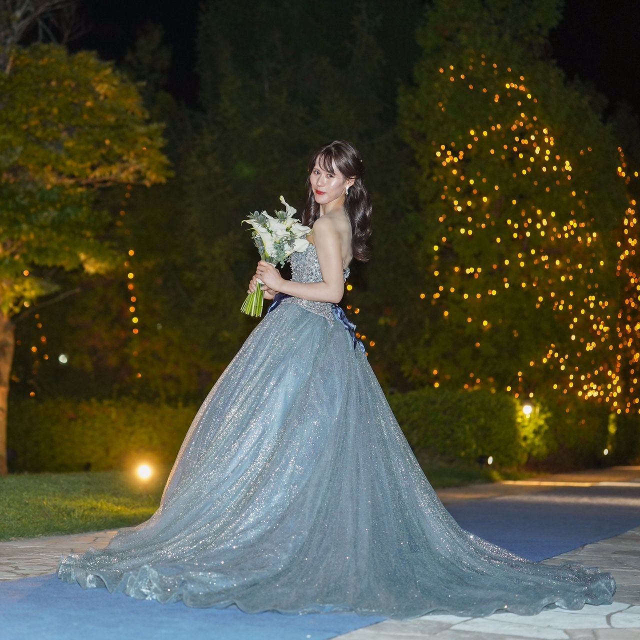 ブルーグレーの色味に、ドレス全体に施されたグリッターがきらきらと輝いているところが気に入っていています。夜のガーデンでも美しく映え、写真映えはもちろん、主役ならではの存在感を感じられるドレスでした。