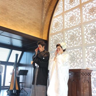 和と洋どちらも合う空間作りです。 最初は白無垢を着た為、演出も小物もとことん和を追求しました。お色直しではウエディングドレスを着たのでブーケや小物も洋風に。常に座っている高砂はこだわりました。和と洋のどちらも合うようにイメージを細かく伝えて作っていただきました。