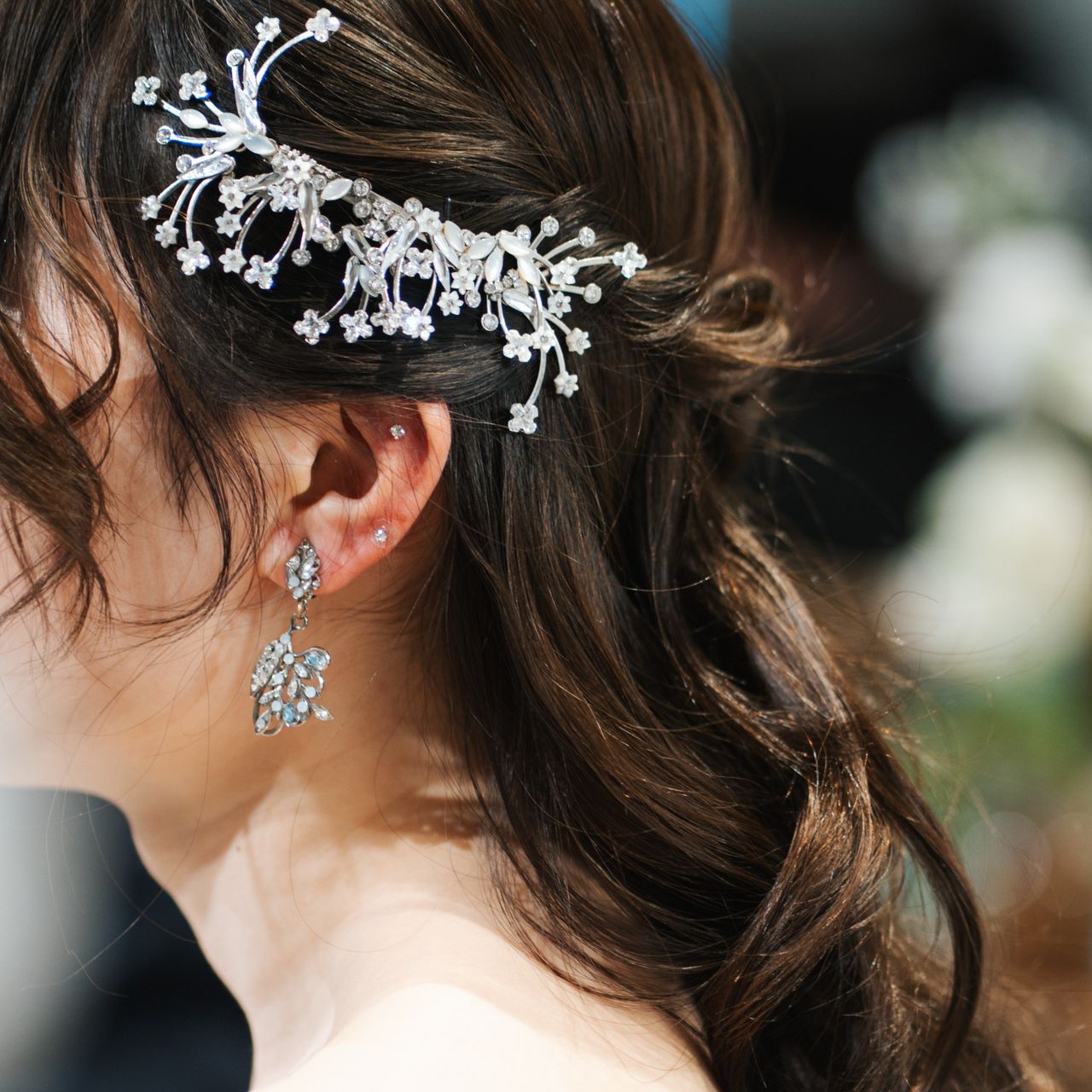 ウェディングドレスではティアラを選択し、2着目では頭の片側に花をちりばめたようなヘアアクセサリーを選びました。イヤリングとセットのようなものを選び、統一感を出しています。