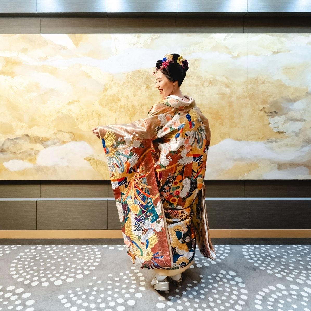 披露宴では挙式の白無垢とはガラリとイメージを変えたかったので、背中にダイナミックな鳳凰が描かれた色打掛をチョイスしました。