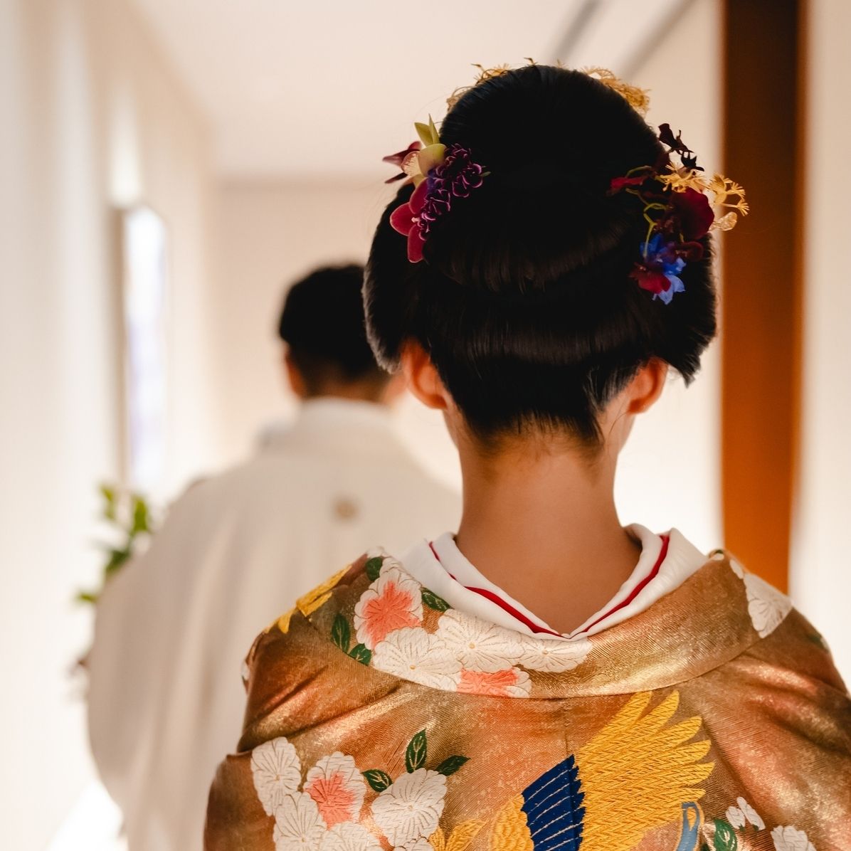 白無垢・色打掛は新日本髪で生花をたくさん飾ってもらっています。