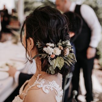 アットホームでナチュラルなウェディングがしたかったので、ブーケもアースカラーでまとめ、ヘアアクセサリーなどもドライフラワーにしました! 家族のつけるヘアアクセサリーやブートニアも、自分で作ったドライフラワーのアクセサリーをつけてもらいました!