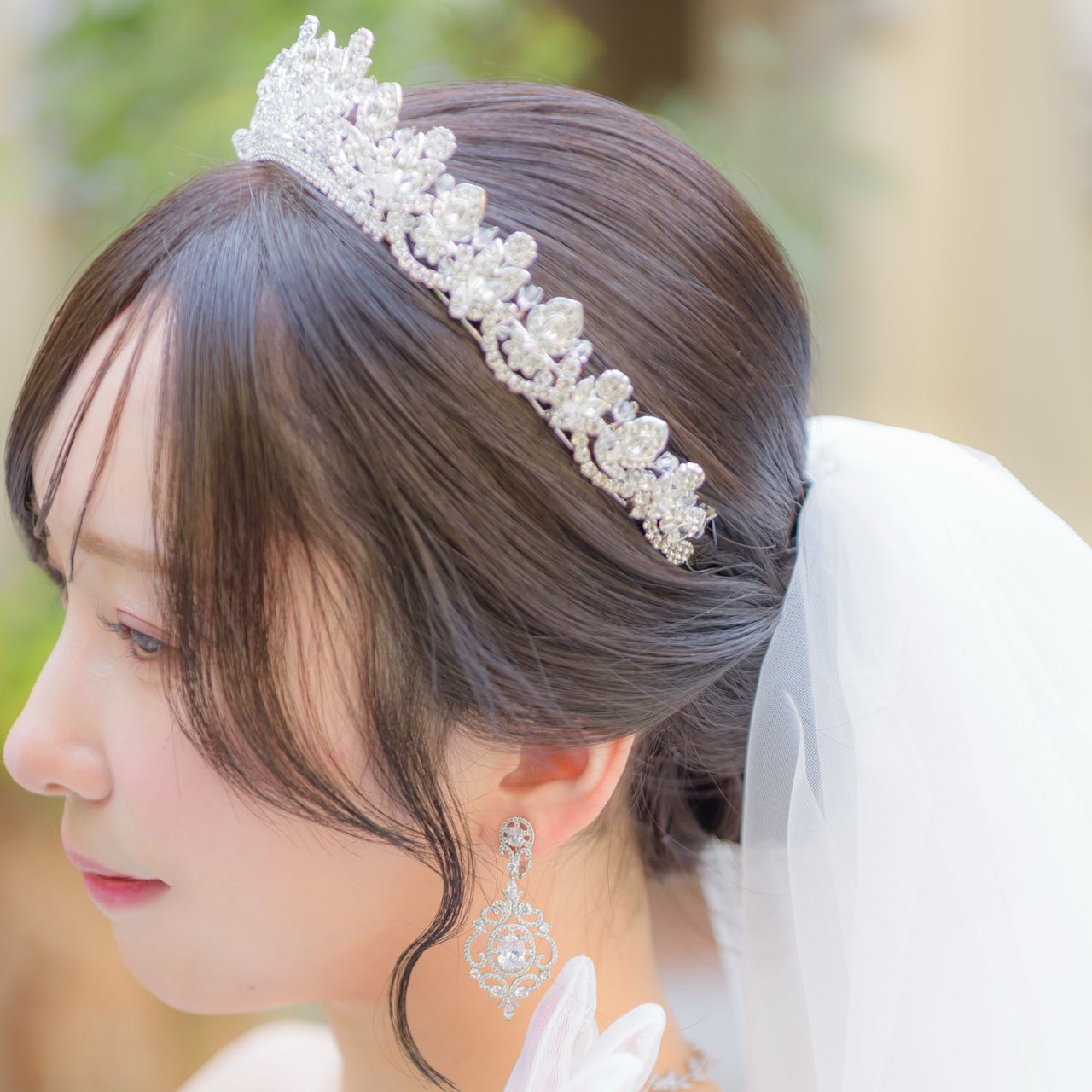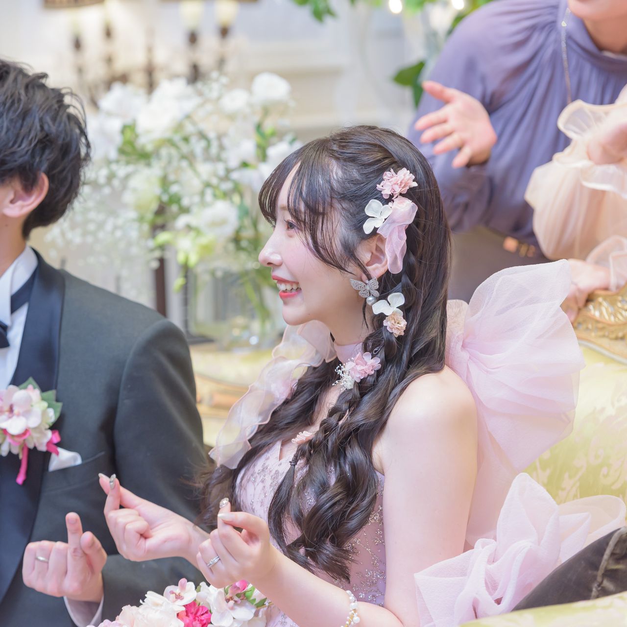 ウェディングドレスでは綺麗めでいたかったので、前髪はポイントで垂らしてサイドに流していただきました!
