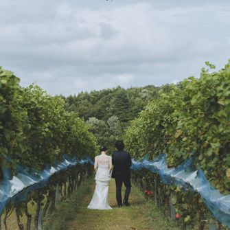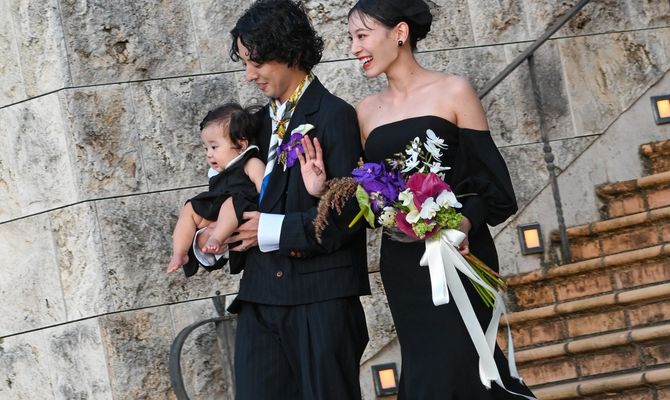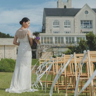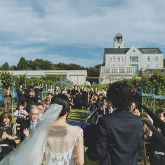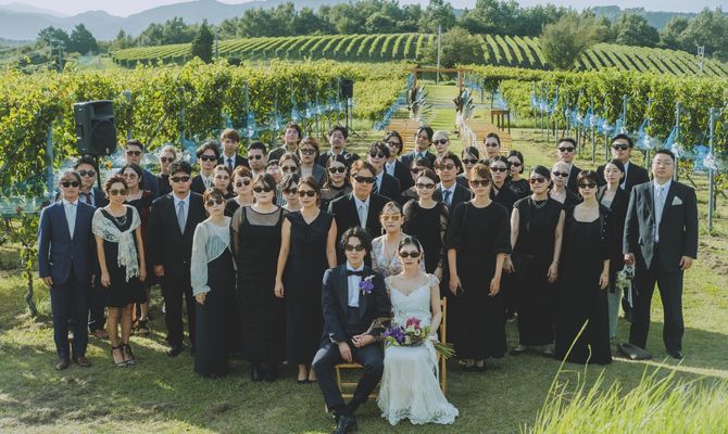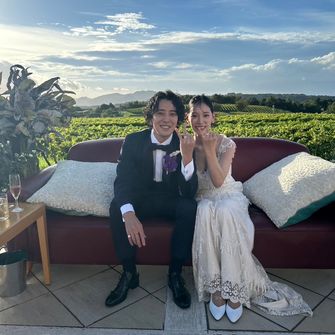 海外のガーデンウェディングの様なパーティー感覚で、少しカジュアルめに行いました。装花や装飾は少しシックなかっこいいテイストにしています。
