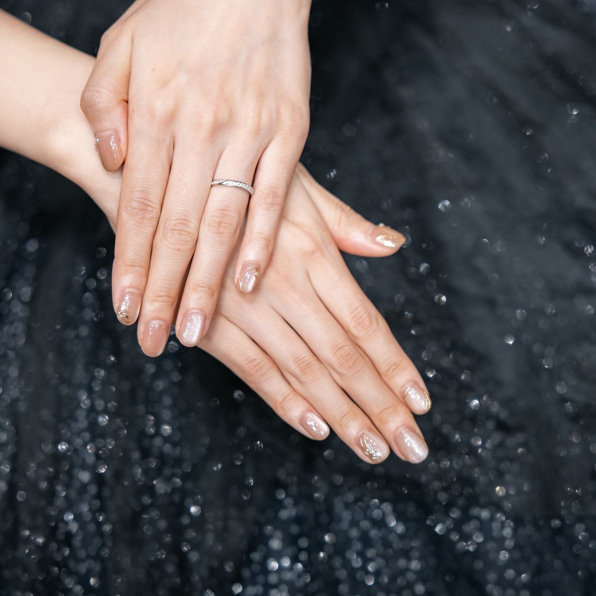和テイストでまとめたかったこと、国内ブランドが良かったことで候補に上がっていたBIJOUPIKOさんにお邪魔しました。悩んでいた際に「違うブランドで重ね着けすれば、2人だけの重ね着けができますよ」と言われ、被りたくない旦那が即納得しました。