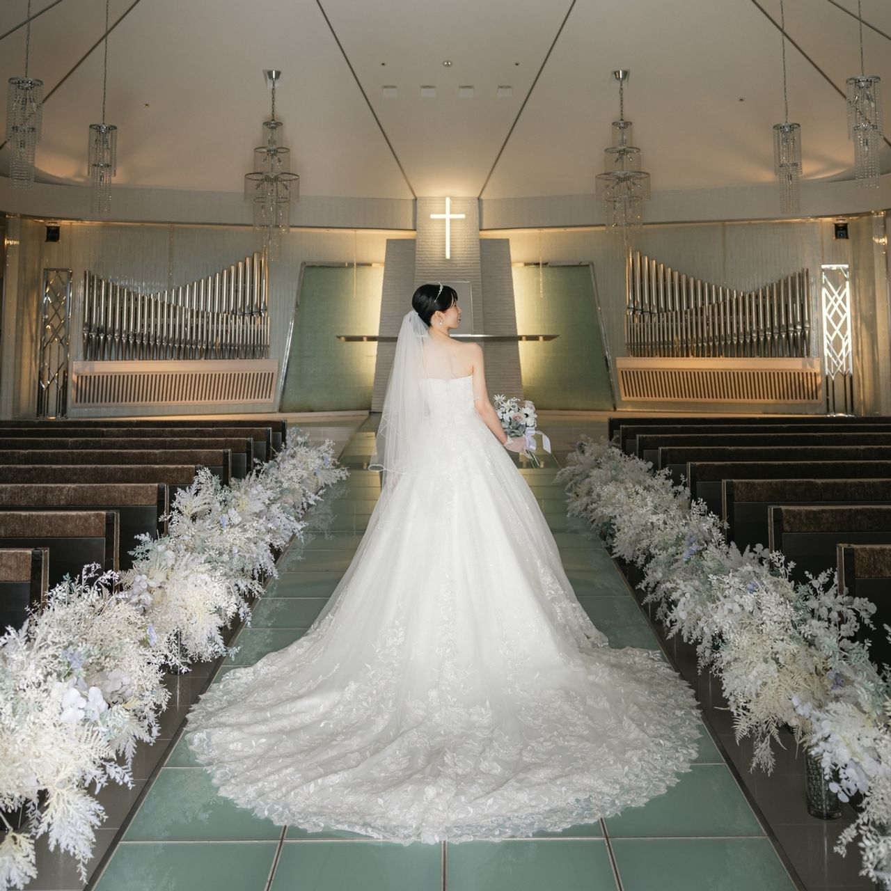 白いチャペルと光るバージンロードはドレスがとても映えます!バージンロードがスロープになっており、どの位置からでもゲストが見えやすくなっているのもポイントです。