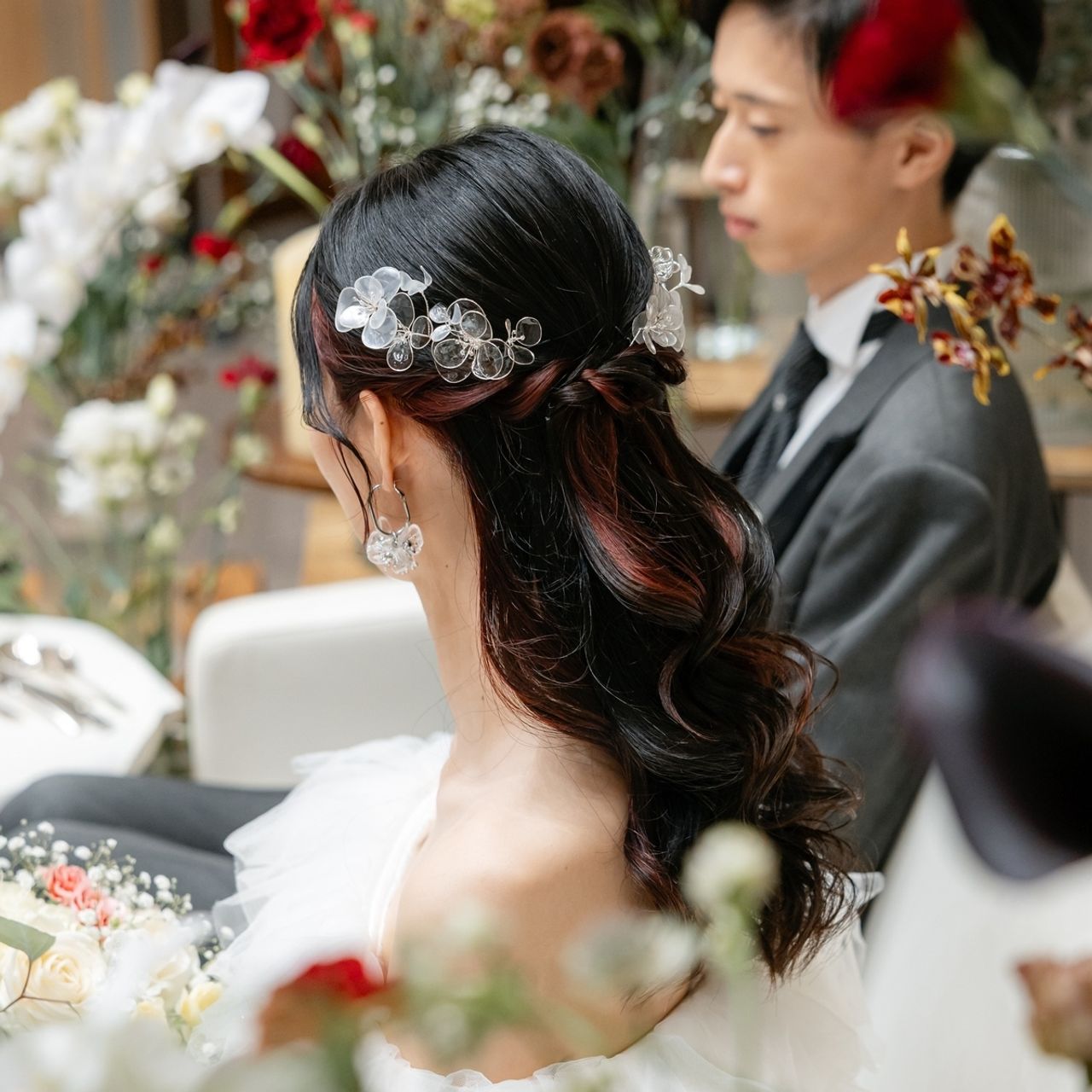 披露宴入場ではアメリカンフラワーのヘッドアクセサリーにしました。ハーフアップ部分に着けられる花モチーフのものを探していたところ出会いました。繊細なクリア感がとてもお気に入りです!❁⃘*.゚