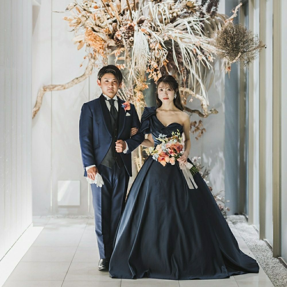 主人と「大人っぽくしたいね」と話していた事もあり、色はブルー系で探していて、理想の落ち着いたネイビーの色味とワンショルダーのリボンがあしらわれていてとってもお気に入りのドレスです。