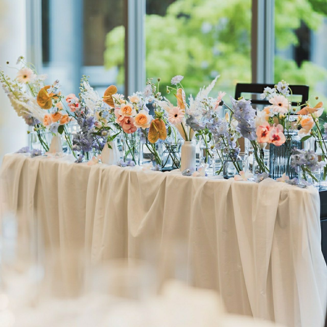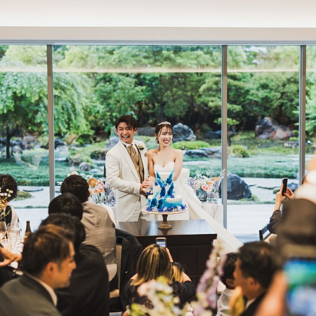 高砂の後ろ一面が大きな窓になっていて、緑に囲まれた景色が広がる開放的な空間は本当に素敵でした。ナチュラルで上品な雰囲気があり、装花もより映えて見えます。
