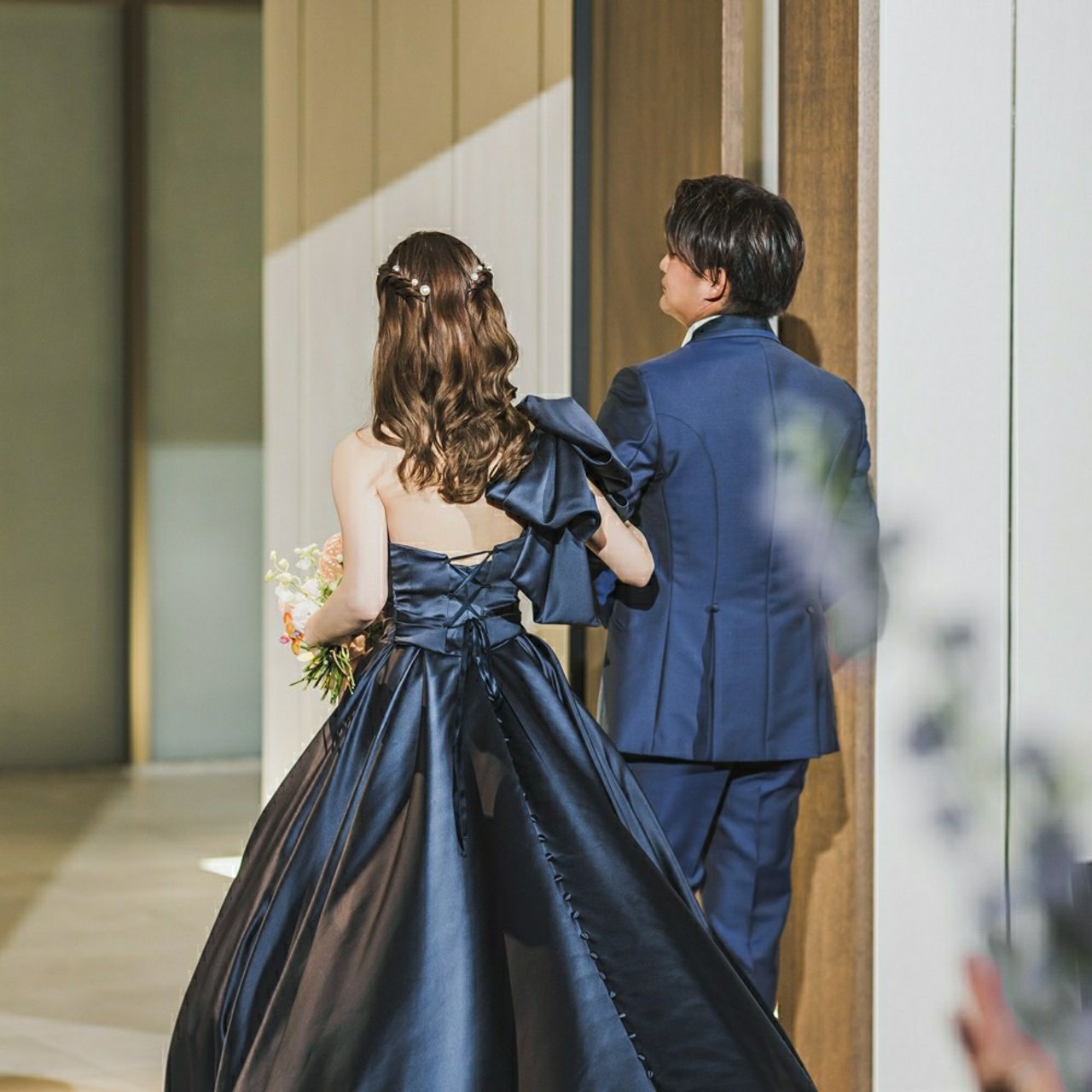 大人っぽいネイビーのカラードレスに合わせて細めの黒リボンにしました♡