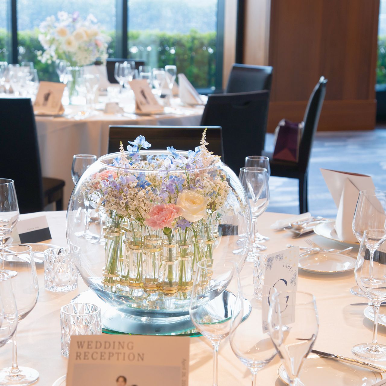 花瓶やキャンドルにもゴールドやシルバーは使わずガラス素材で統一し、透明感を意識したコーディネートにしました。
