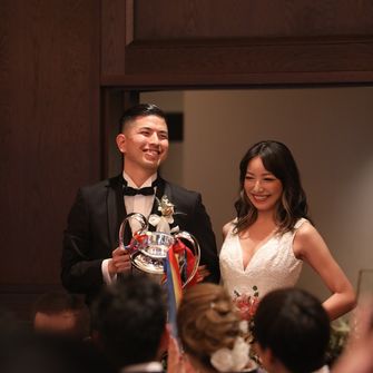 オシャレな感じにしたいけど、アットホームさや遊び心もいれたい→(新郎がどうしても大好きなサッカーの要素もいれたいとのことでしたので、ヨーロッパチャンピオンズリーグのトロフィーを持ち入場→世界一幸せでイケてる夫婦の1位というコンセプトもいれよう。)