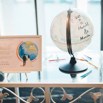 付き合う前にユニバデートをした際、入場のシンボルである地球儀の前で告白してもらった思い出があり、結婚式場もその思い出の場所に近いところでと考えていました。