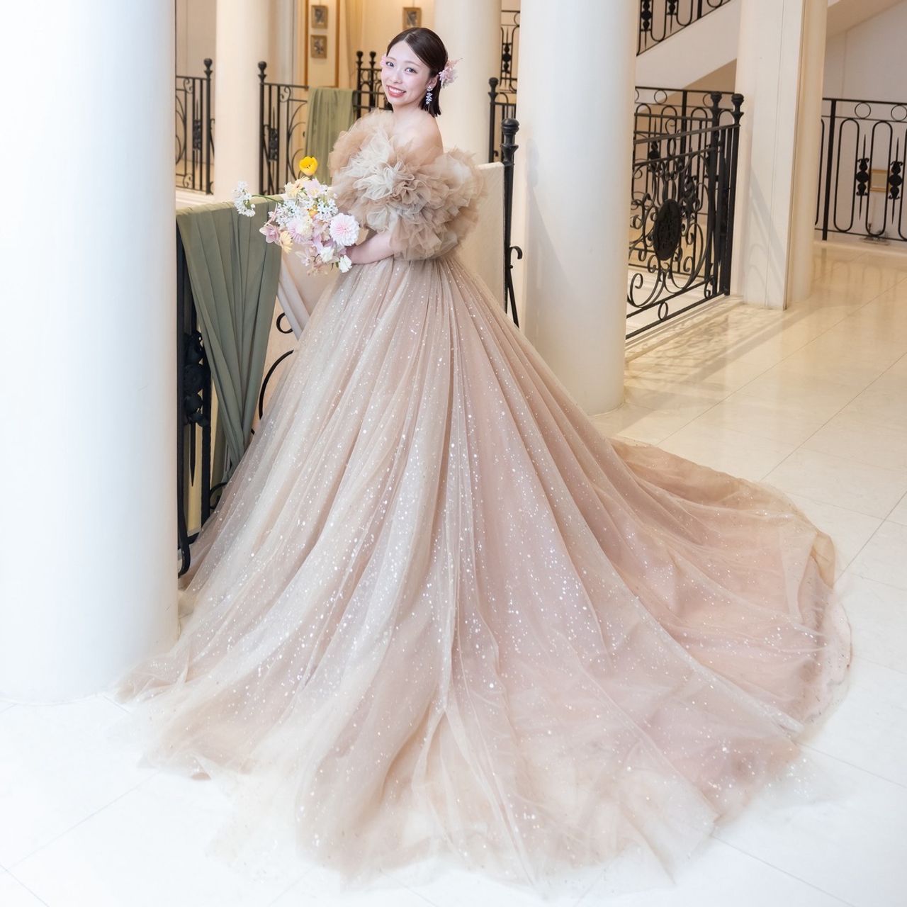 ウェディングドレスがすらっとした綺麗めだったので、カラードレスは可愛い系にしたいと思い、ベージュのふわふわドレスを選びました。ラメが入っていて、動くたびにキラキラと光り輝くのが可愛すぎました!
