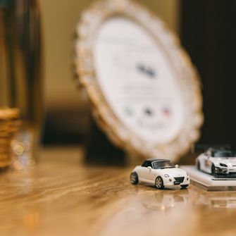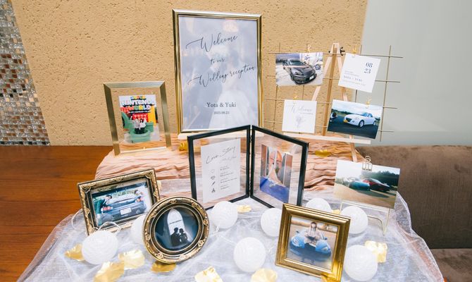 夫婦で車が好きなため、車にこだわった演出を取り入れました。ウェルカムスペースにホイールを置いたり、夫の友人に車を持ってきてもらって会場前に並べたりしています。ウェディングケーキもホイールをイメージしたデザインです!式場選びでは、車を会場前に並べられることと、教会の雰囲気に惹かれたことが決め手となりました。