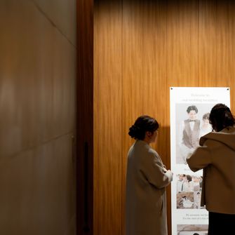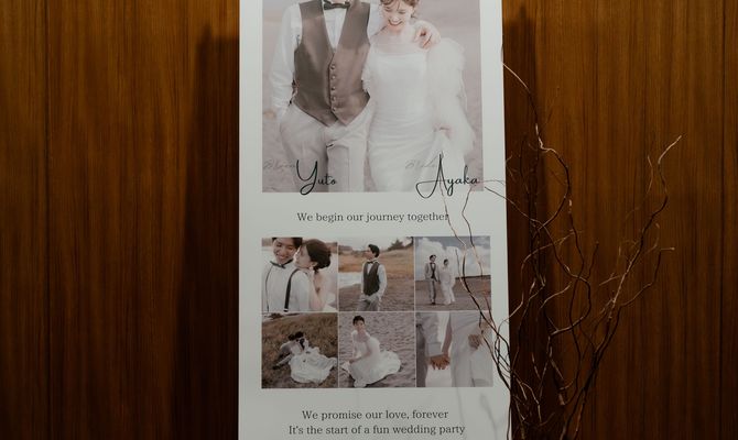 TIAD,Autograph collectionの待合室や披露宴会場が洗練された空間だったため、ウェルカムスペースやペーパー類はシンプルにしました。それに加え、装花で可愛さをプラスして大人可愛い空間に仕上げました。