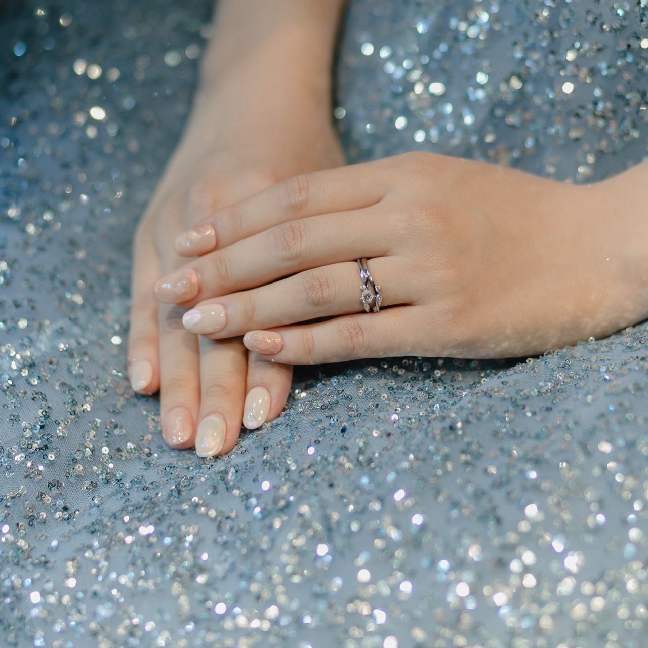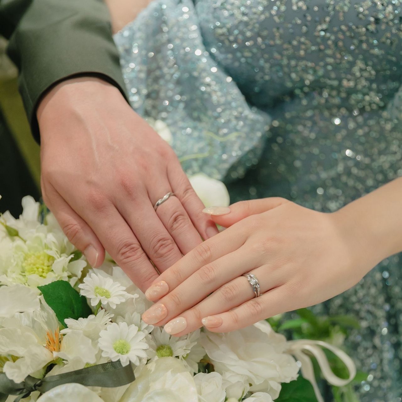 元々セットリングが良かったので、セットリングで一つのデザインになるようなものを2人で見に行きました。新郎とは同じブランドで合わせています。植物着想のデザインなので柔らかいニュアンスがとても気に入っています。
