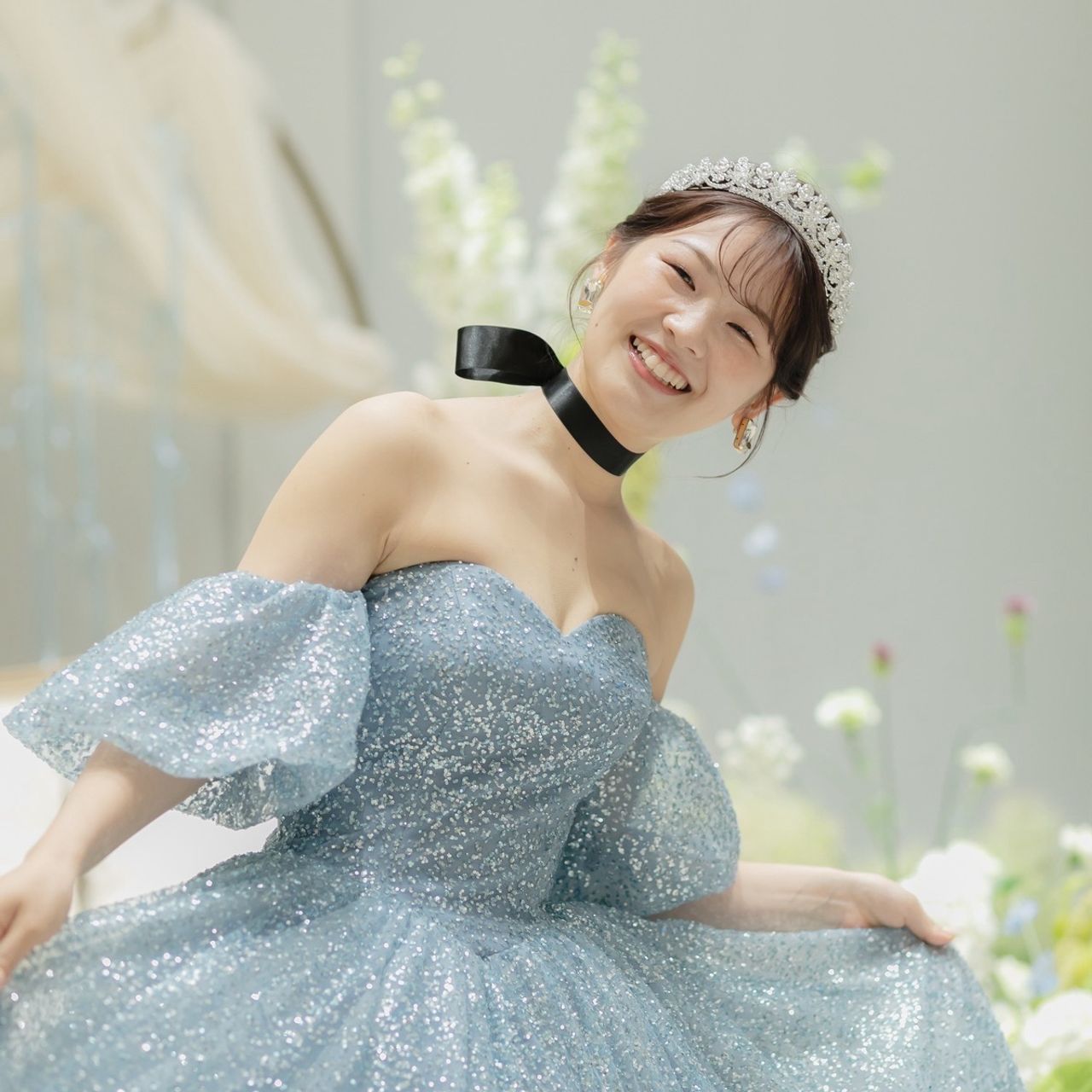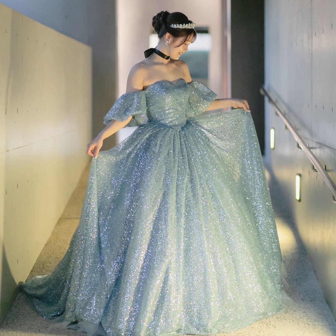 AULANOVAでDWS 0125/BLUEを着用しました。スパンコールグリッターチュールで、シンデレラが魔法にかかった時の煌めきを表現されたドレスです。元々カラードレスが決まらず悩んでいたのですが、たまたま入荷予定のタイミングで試着することができ、ブルーの色味が肌に合い即決しました。
