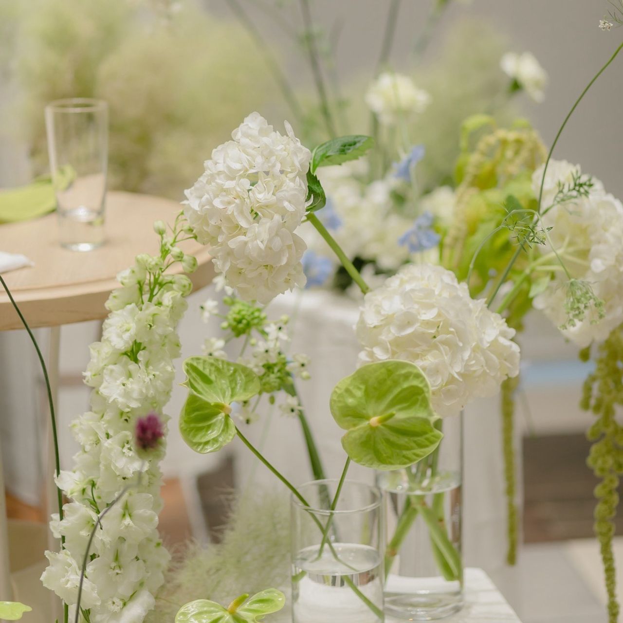 6月の式だったため、アジサイをメインに使いたいと思っており、そこにプラスしてテーマに合ったニュアンスのお花や素材の組み合わせを何度も提案したことを覚えています。元々個性的なものや、異素材が好きな私の意見を丁寧に汲み取って下さり大変感謝しております。