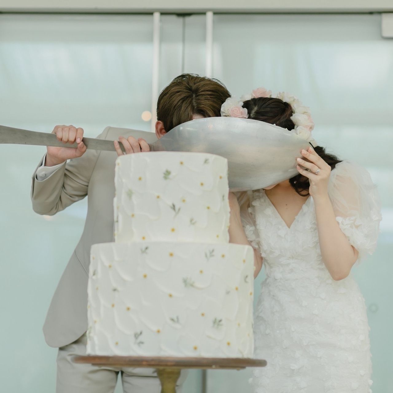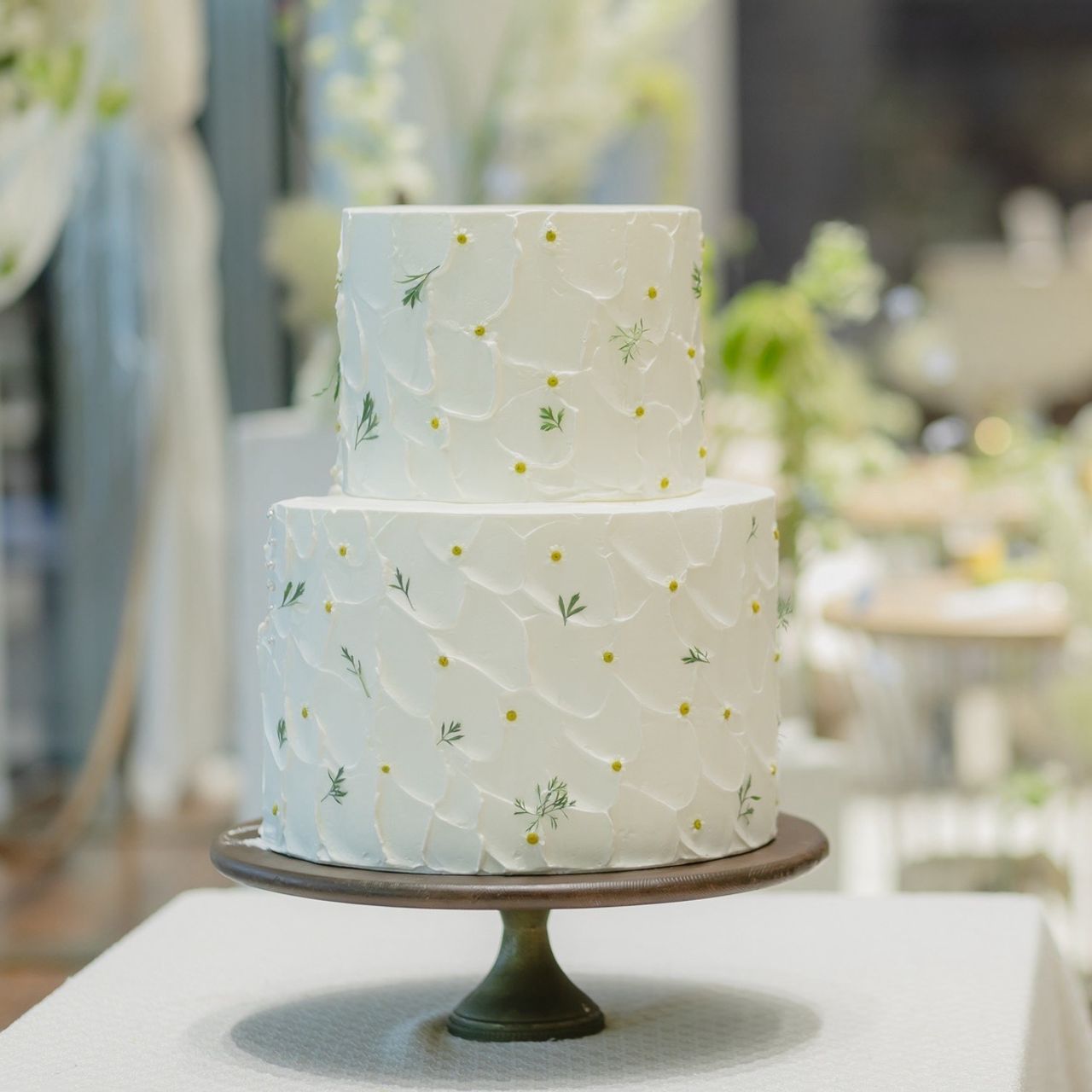 会場に馴染むウェディングケーキにしたく、ナチュラルテイストにしました。ホワイトを基調とし、会場装花と同じデイジーのようなお花をドット風に張りつけて頂きました。当日までケーキが見れないため、ご依頼が難しいなと感じました。