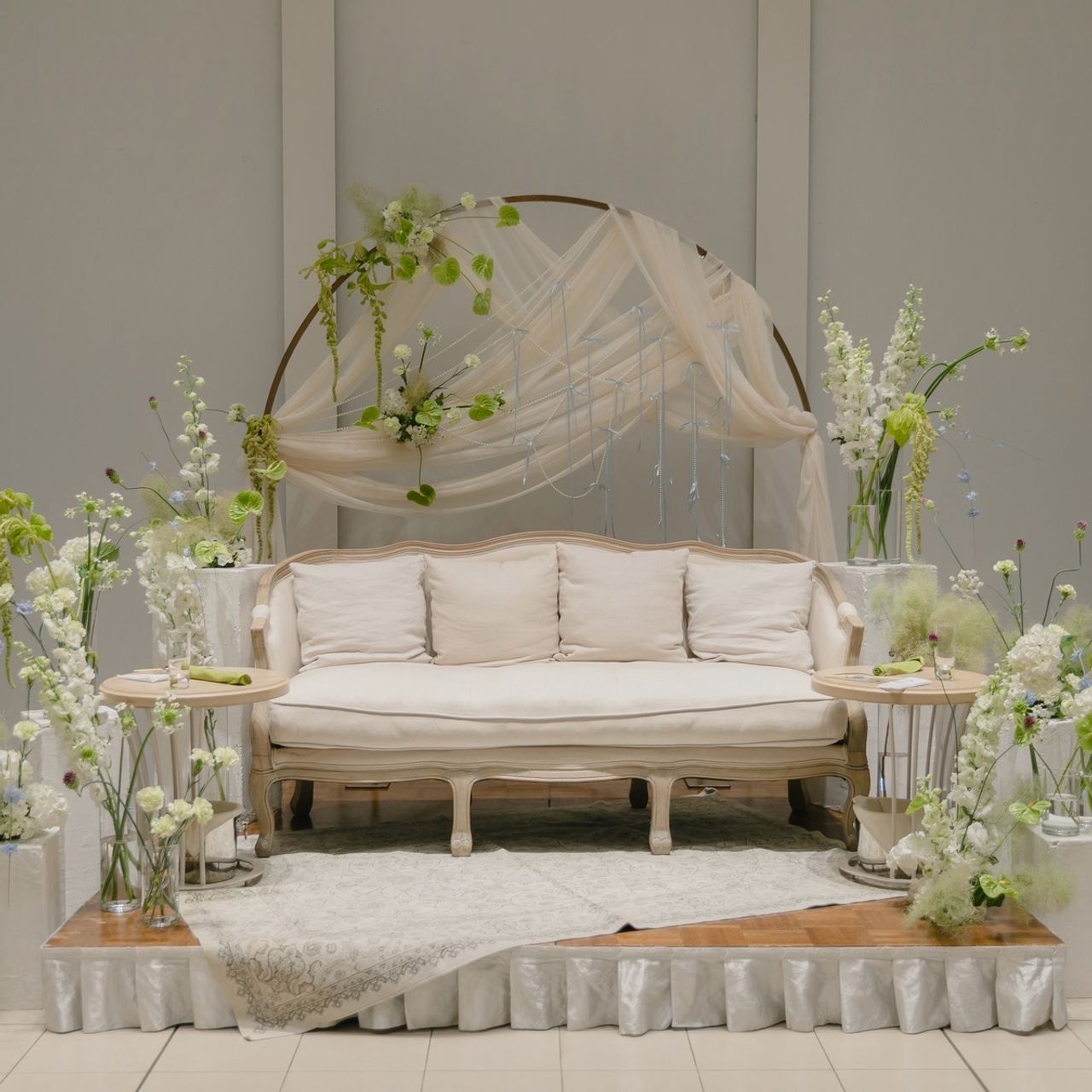 二人ともフランスにまつわるものを好きになりがちで、優美な曲線美や柔らかい印象が好きだったようです。加えて、大切に時を重ねたからこそ、懐かしさも感じながら、厳かにお互いや皆様への愛情が伝わるような1日にしたいと思っていました。2人らしく、穏やかでありつつも軽やかで心が躍る。それでいて結婚式ならではの幸福感や華やかさも忘れず。そんなことを考えていたらテーマが4つになっていました。