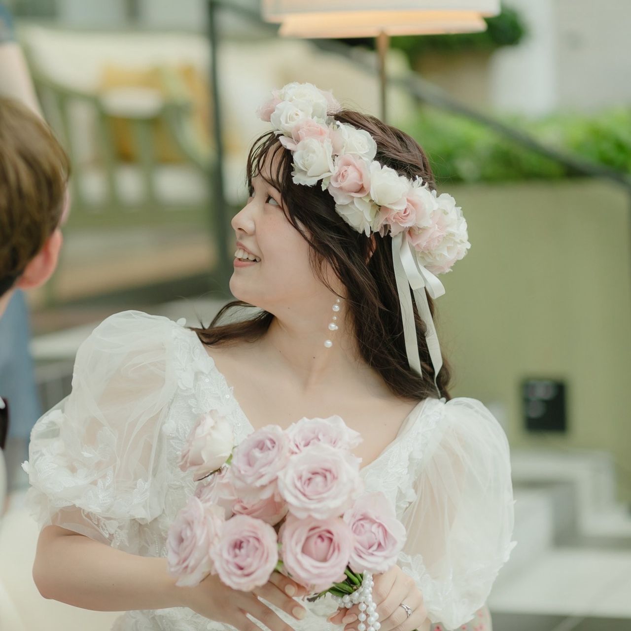 “ウェルカムスペースなどの小物や高砂、テーブル、ブーケ、ケーキのお花を何かとリンクさせたい”というわがままな希望をあの手この手で叶えて下さり、また私もどこまで自由が利くのかわからなかったのでフローリスト目線の提案力や追求心に感心するばかりでした。フラワーベースやリボンの幅なども丁寧にヒアリングして頂き、共感はもちろん、俯瞰的な意見も下さいました。そういった方とはなかなか出会えないと思っているのでとてもありがたかったです。