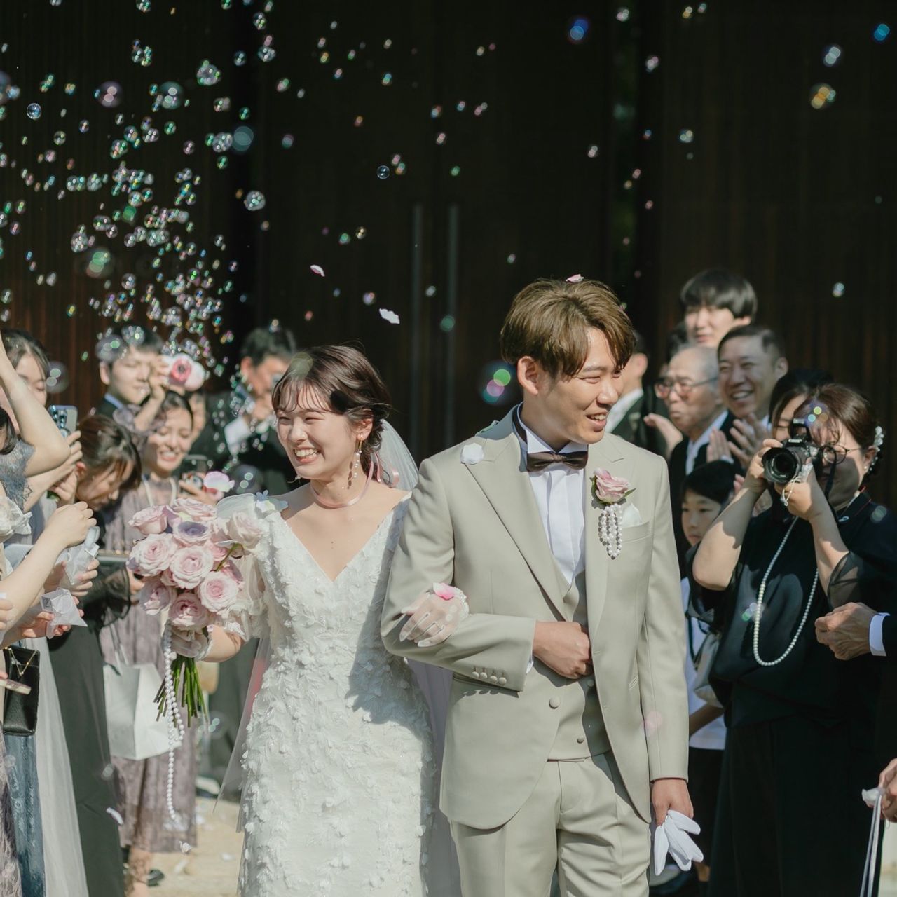 当日幸いにも晴れており、アフターセレモニーで歩いたノモンまでの石畳の道は、とても忘れがたい風景でした。芝生が太陽の光でチラチラと輝いていたり、穏やかな風にのる花びらとバブル。どこを切り取っても感動的な空間だったのを覚えています。