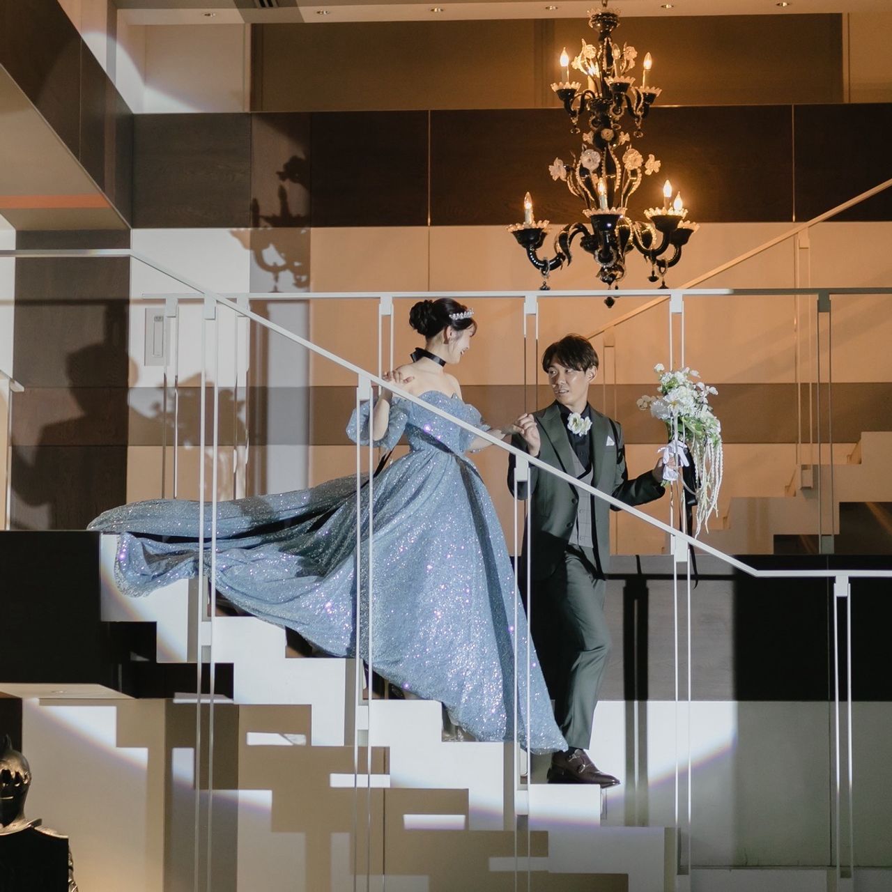 恥ずかしくて誰にも話したことはないものの、実は昔から好きだったシンデレラ。イザベラ邸のシャンデリアの下で、憧れのドレスで好きな人に手を取ってもらいながら階段を下りることができてとっても幸せでした。お色直しの後の会場が真っ暗な中、スポットライトを浴びてドレスのスパンコールとグリッターが本当に魔法のように輝いていて、少し動くだけでキラキラとしていて。時々建物のガラスに反射で映る自分がヒロインになったような気分にさせてくれる1着でした。