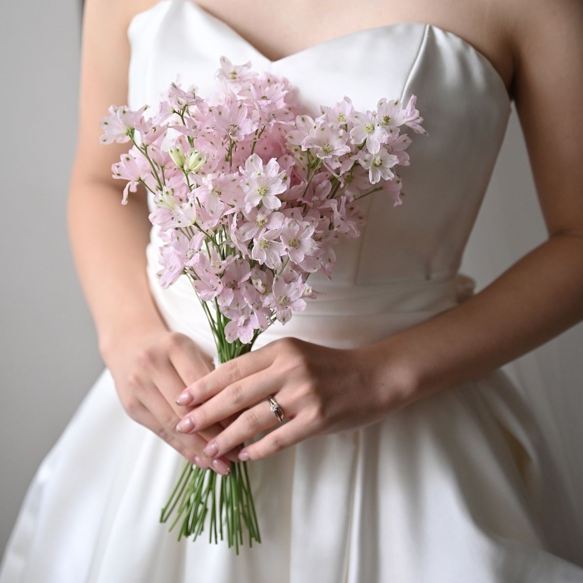 ブーケはピンクのデルフィニウムで可愛らしく、スイートピーをオーダーしたのですが季節柄無かったので、似たお花をご提案いただきました!