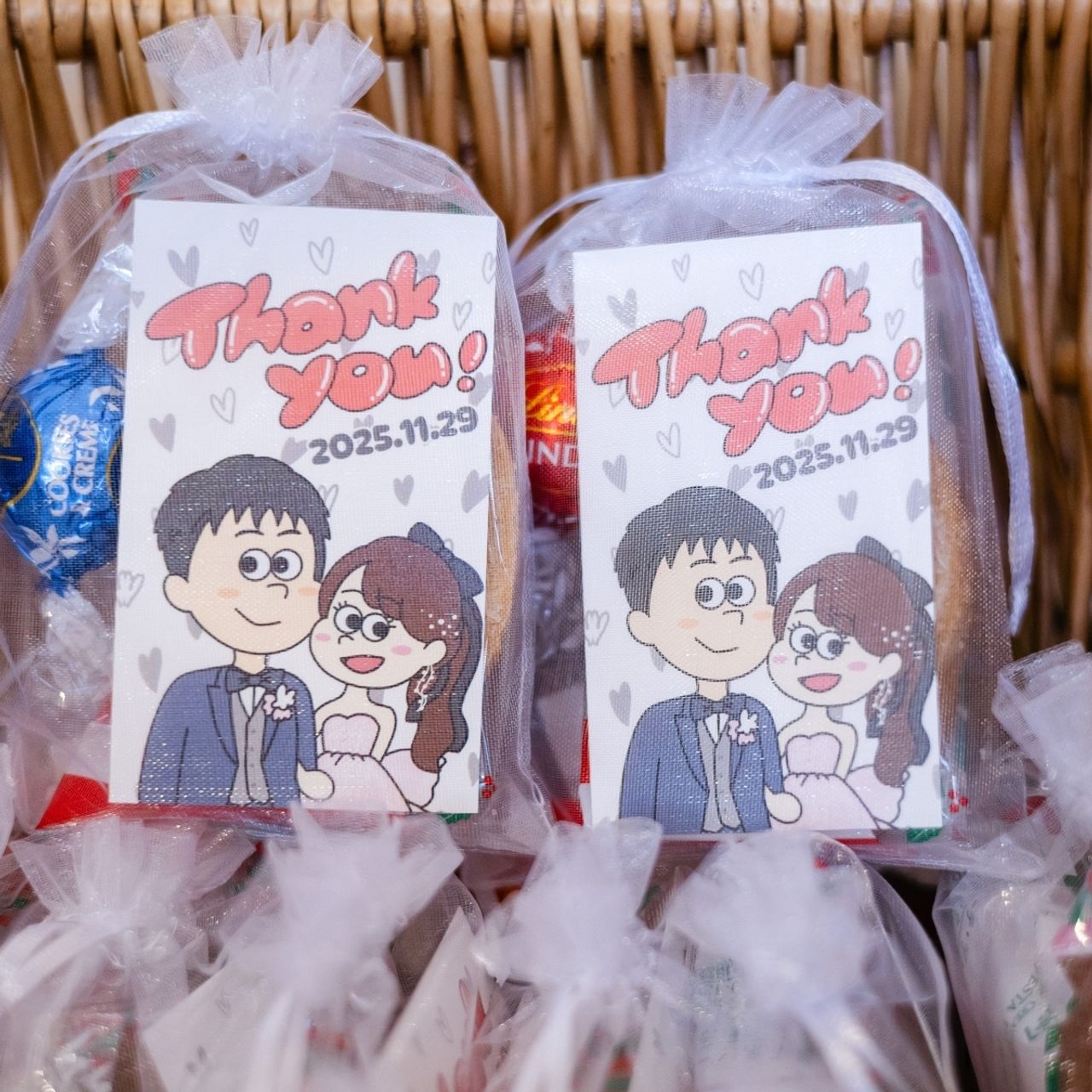 イラストも描いていただき、名刺サイズに印刷したものをThank youカードとして一緒にお渡ししています!