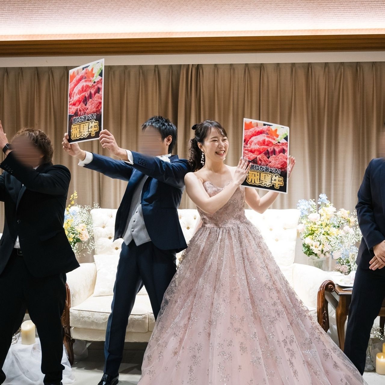 結婚式と言えば新郎新婦が主役、中でも新婦の方が主役と考えている方も多いと思います。もちろんこの考えも間違っていないし、大切なことですが、私は「私たちの一生の思い出となるこの瞬間を、一緒に楽しんで欲しい」という想いを一番に持っていました。そして、その想いを伝えるためには、新郎新婦だけの見せ場ばかりではなく、サンクスバイトや歓談の時間を多く取ることにこだわりました☺️