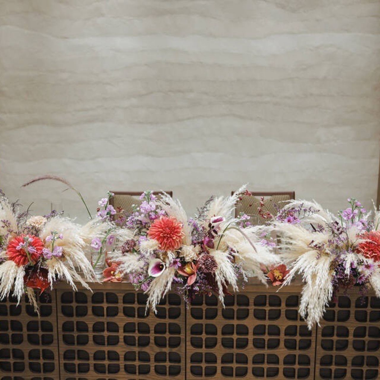 *装花:落ち着いた“シック”な雰囲気を目指し、担当の方と細かくすり合わせながら作り上げています。当日は想像以上の仕上がりで、ゲストから「素敵」と褒めてもらえました。