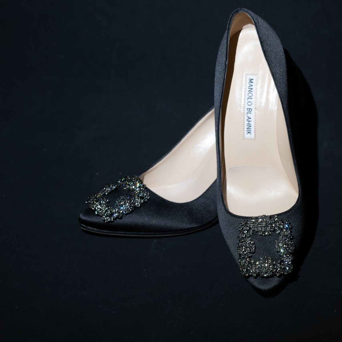 ウェディングシューズは夢だったMANOLO BLAHNIKのハンギシです。色はカラードレスに合わせて黒にしました。王道ですが、キラキラのビジューが本当に素敵で、ドレスとかっこよく合わせられる!と思い選びました。