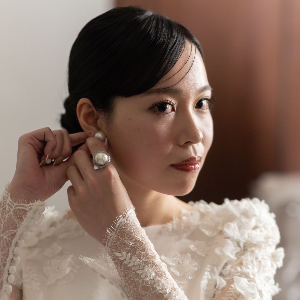 披露宴入場ではヘアスタイルも変えたので、ピアスもチェンジしています。こちらもSWAROVSKIのピアスで、リボンがツイストされたようなデザインが可愛くて選びました。祖母のパールの指輪もそのままつけています。