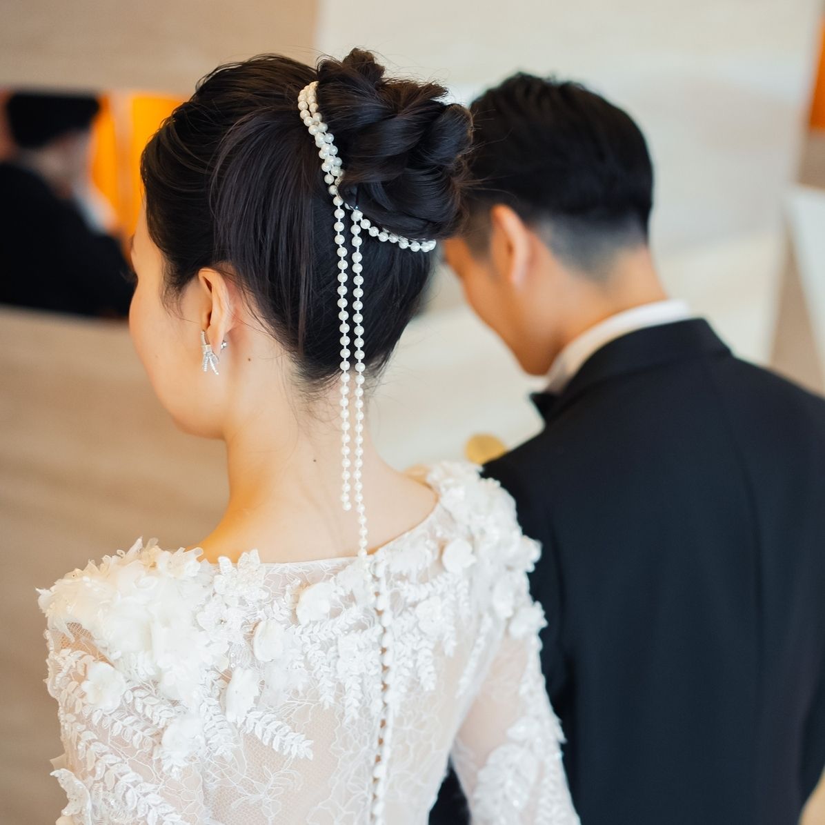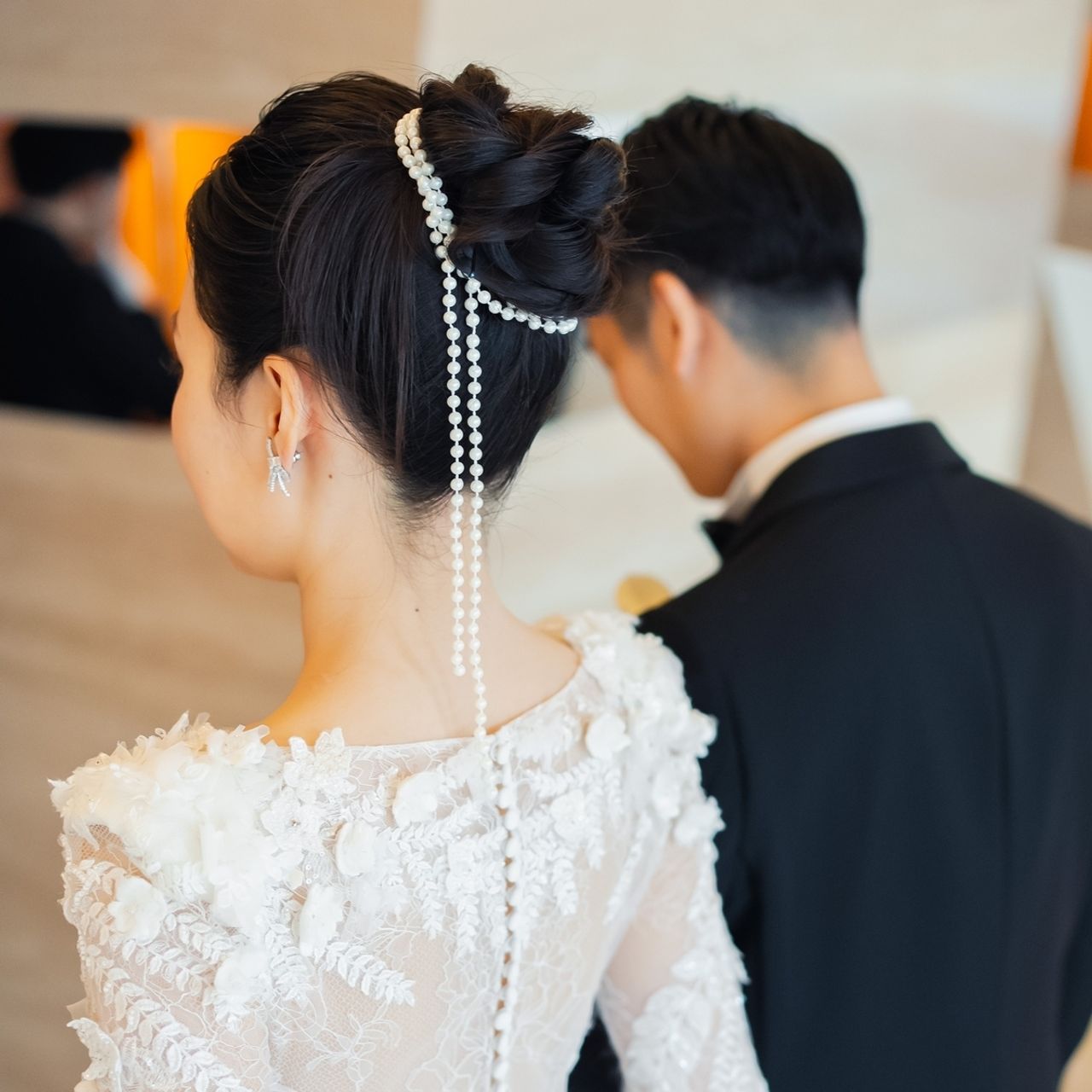 挙式は上品にタイトなシニヨン、披露宴入場ではかっこよくオールバックでお団子スタイルにしていただき、持ち込んだパールを最後に巻いて自分らしさを出しました。お色直しでは、大きめのカールで髪を巻いていただき、印象を変えるためにダウンスタイルにしています。普段はストレートヘアばかりなので、凄く新鮮でした。