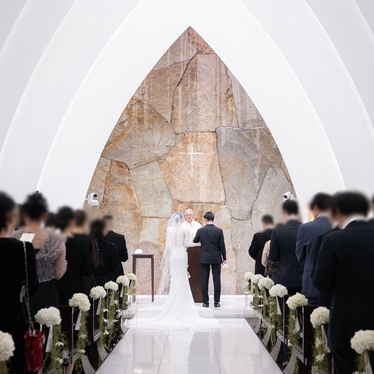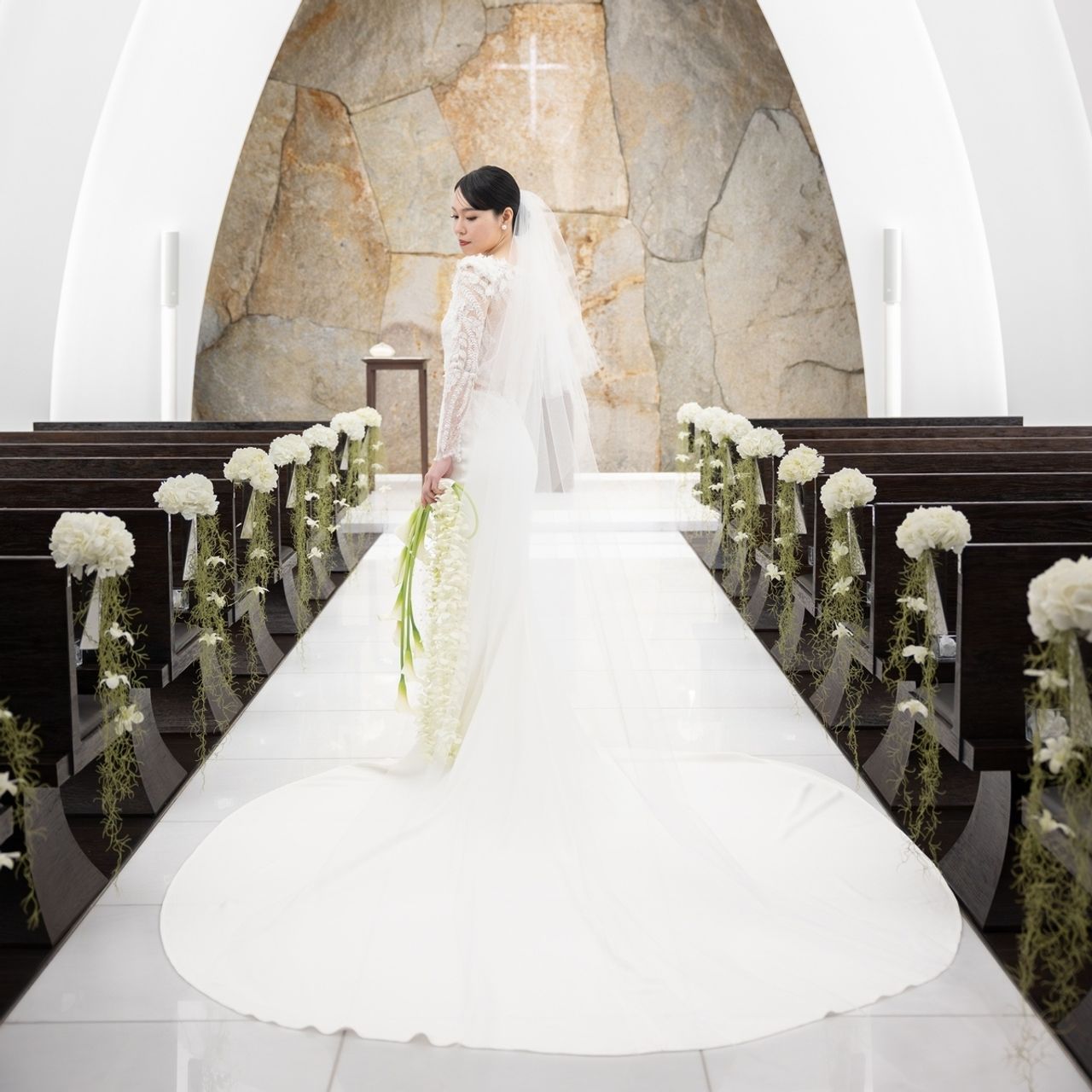 真っ白で上品なチャペルに一目惚れをしてこの会場を選びました。扉を開けた瞬間にチャペルのために作られたアロマの香りが漂い、特別な空間が広がります。また祭壇には天然石が使用されており、そこから流れている水が凄く神秘的です。友人たちが撮ってくれた写真も白いチャペルが本当に映えて、素敵な写真ばかりでした。