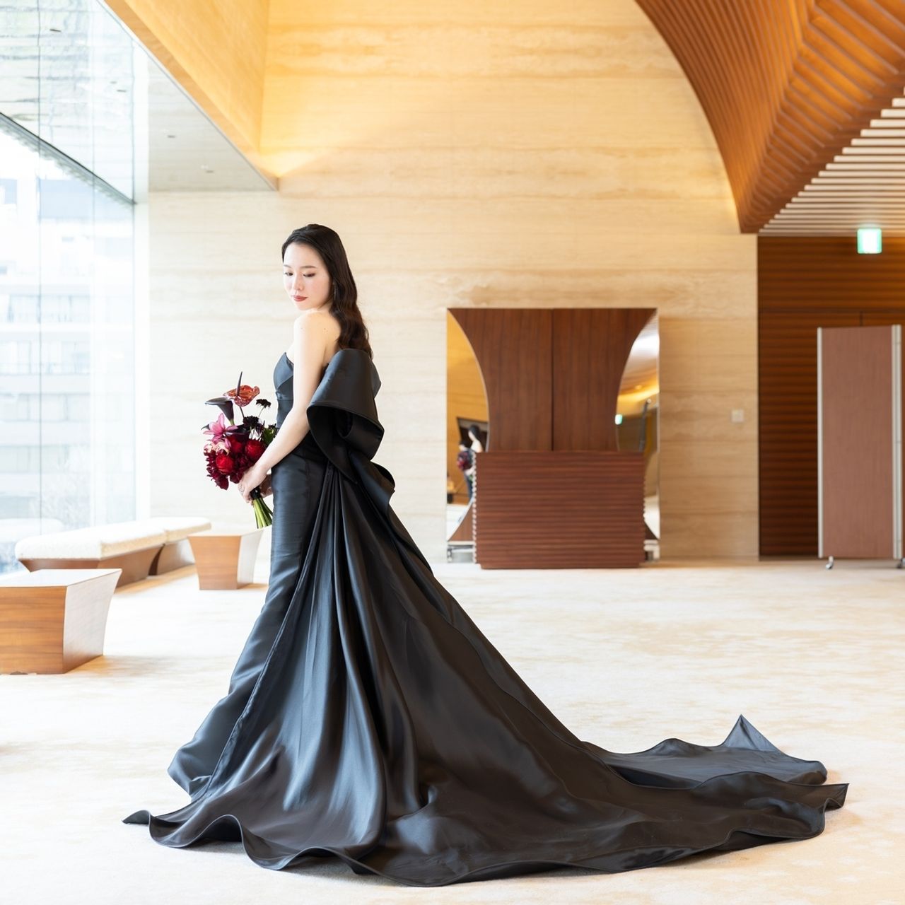 1着目で細身なドレスが似合うとわかったので、2着目も同じマーメイドタイプを選びました。黒いドレスは「あなた以外には染まりません」と言う意味もあるらしく、素敵な意味だなと思いそれも含めて黒色にしました。友人や家族からも好評で嬉しかったです。
