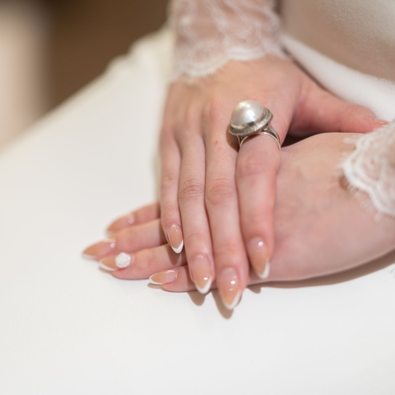 ネイルはシンプルに白いフレンチネイルにしました。細めのフレンチで、ベースはベージュのグラデーションにしていただきました。左手の薬指にだけ白い薔薇のパーツをつけています。会場のロングテーブルも薔薇をメインに使っていたので、それに合わせてつけてもらいました。