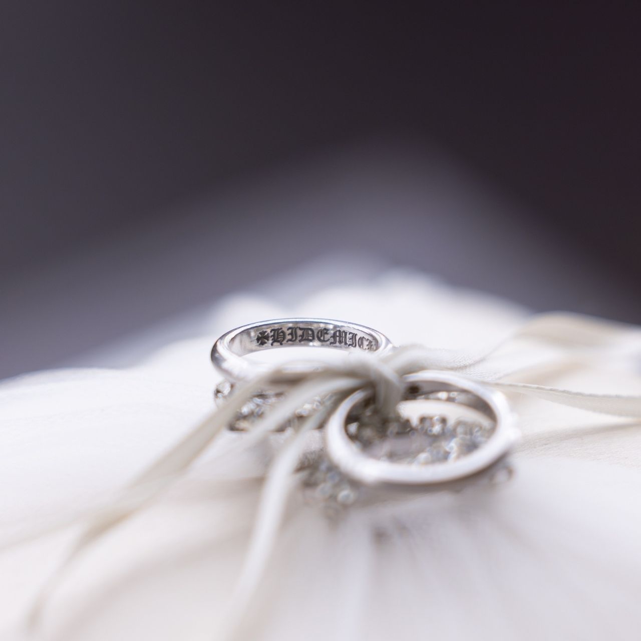 結婚指輪は私と主人が大好きなChrome Heartsの指輪にしました。オーダーをしてから受け取るまで半年かかりました。内側にはChrome Hearts特有のオールドイングリッシュで名前が彫られています。シンプルな指輪ですが本当にお気に入りです。