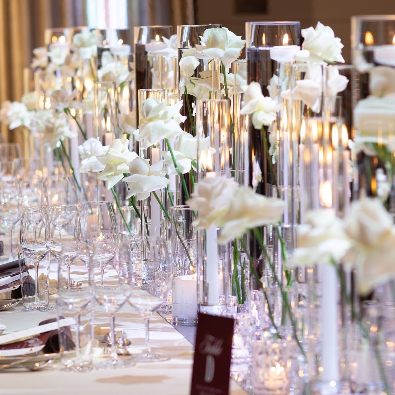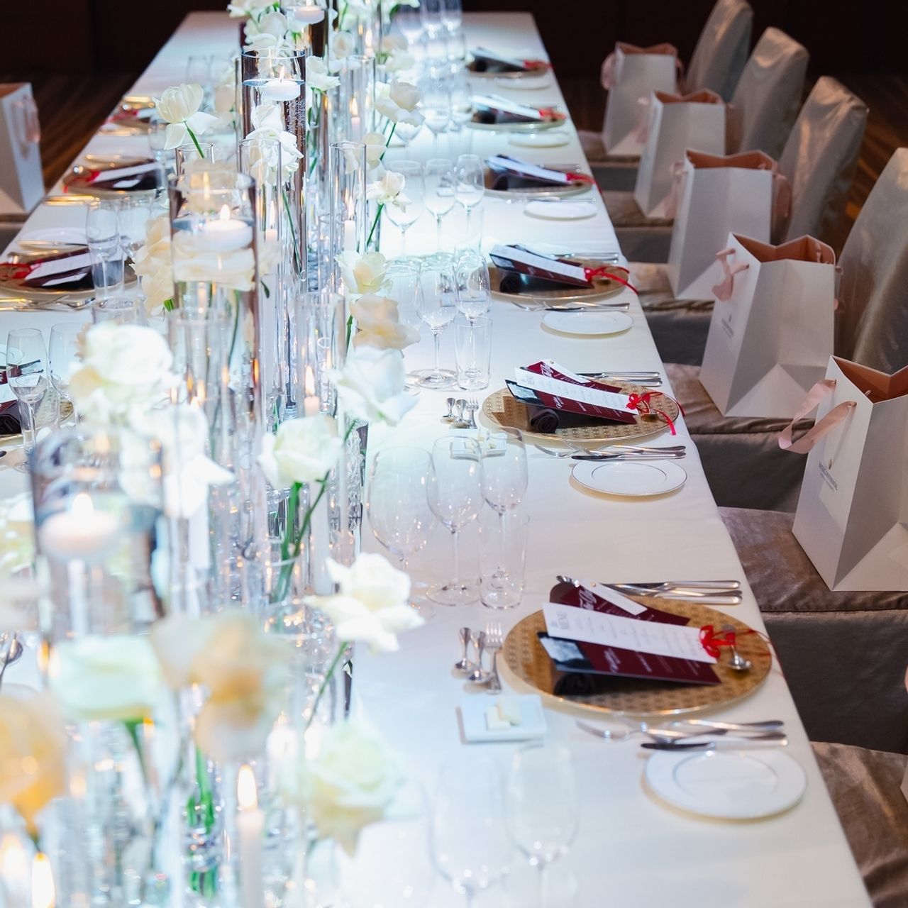 高砂のソファ周りはとにかくお花をたくさん使って華やかにしていただき、ロングテーブルは長さを変えて白い薔薇のみで、キャンドル、ミラーも敷いてかっこよく上品な雰囲気にしていただいています。
