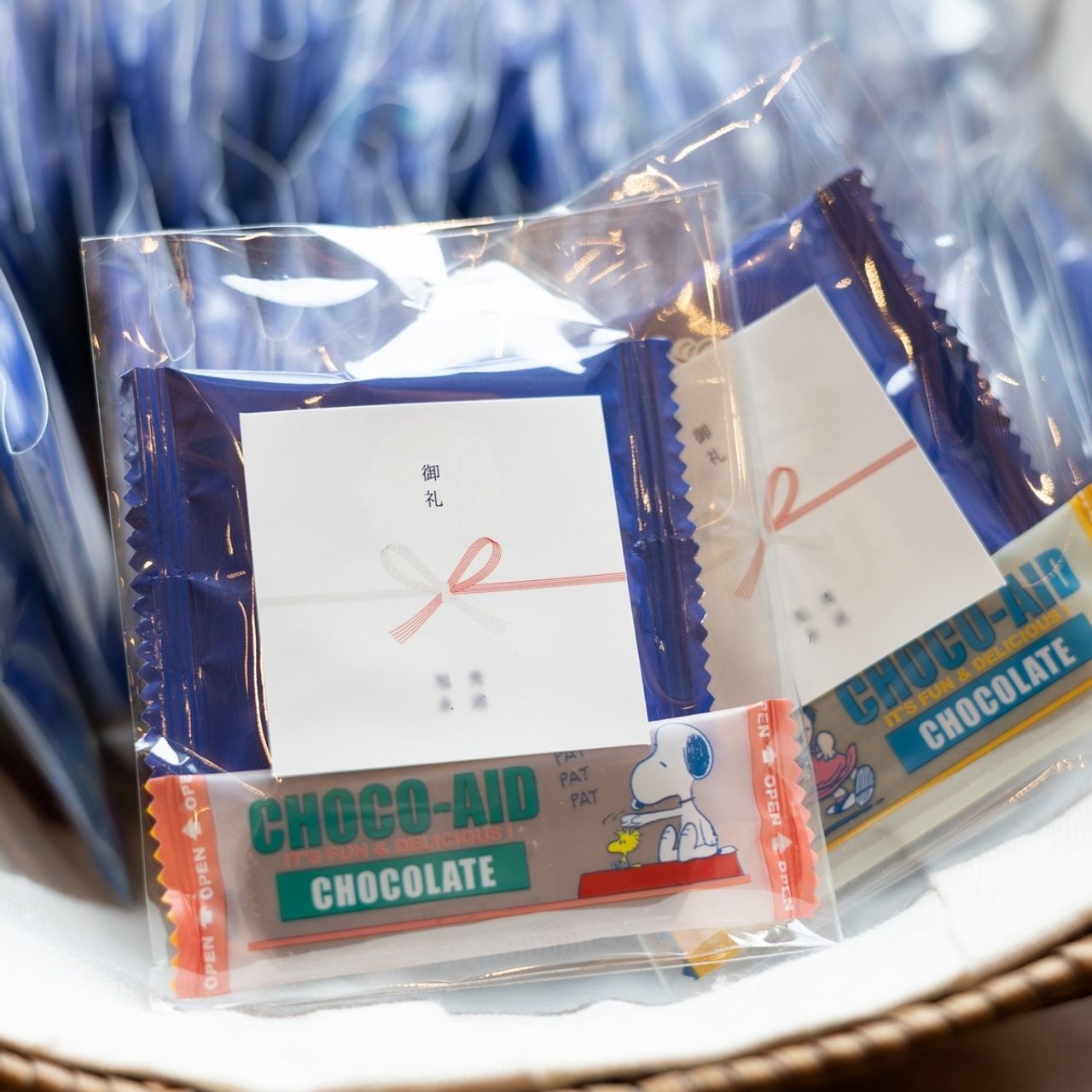 私が大好きな大阪の阪急百貨店でしか買えないVANIのサンドクッキーとPLAZAで購入したPEANUTSのキャラクターのチョコエイドです。袋に入れて、熨斗風に自分たちの名前を入れて作ったステッカーを貼ってお渡ししました。