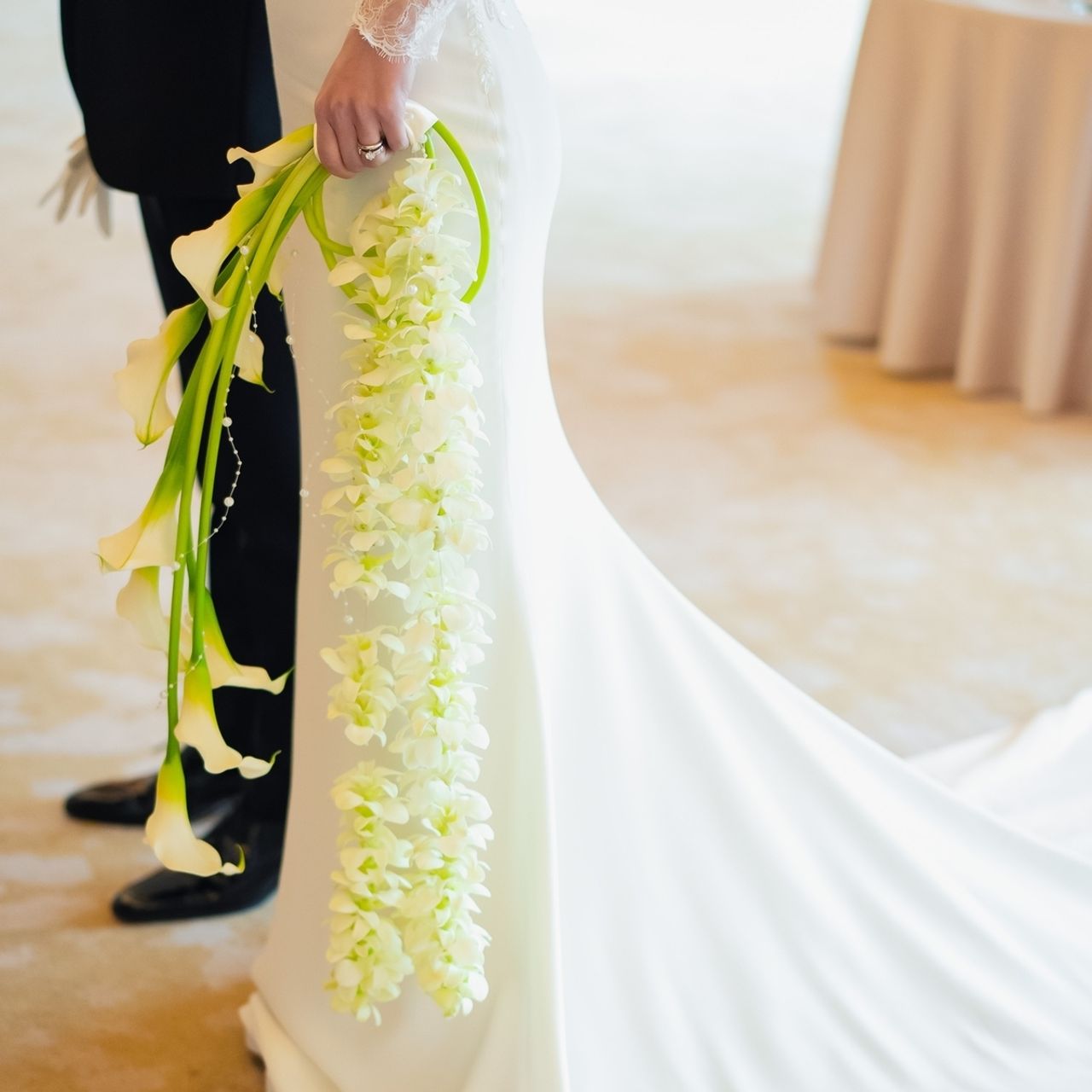 ウェディングドレスに合わせたブーケは、カラーのお花をメインに使っていて、本当におしゃれなブーケになりました。実は私の母も自分の結婚式でカラーのブーケを持っていたそうで、凄く嬉しかったです。
