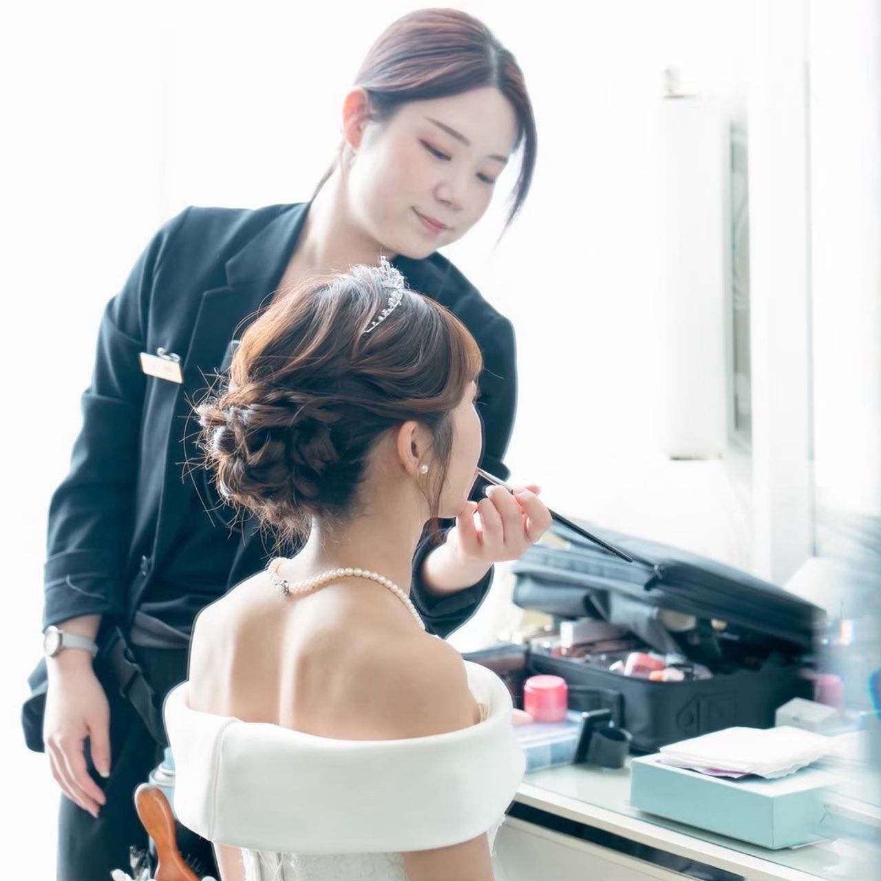 メイクは特別なこだわりは設けず、濃くなりすぎないようにナチュラルな仕上がりにしています。ドレスやヘアが引き立つよう、透明感を大切にしたメイクにしました。