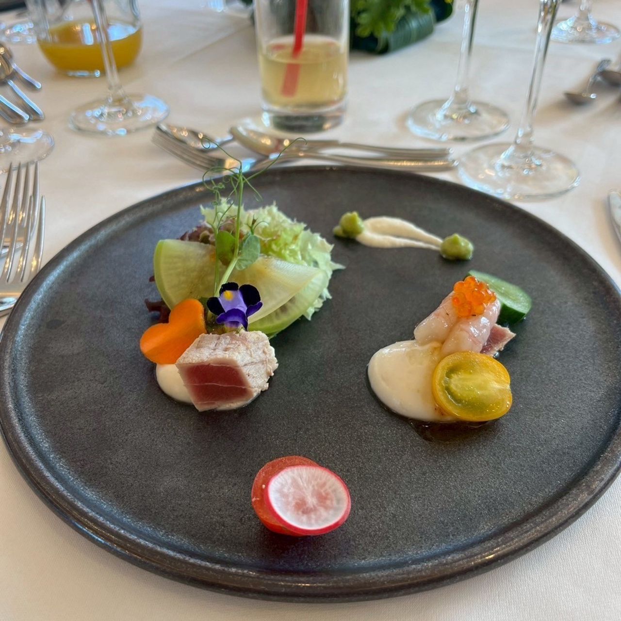 一品目の“融合SUSHI”は、寿司をフレンチと融合させた一皿で、単体で味わうのではなく、食材やムース、ジュレと合わせていただくスタイルです。見た目も味わいも新鮮な、少し遊び心のあるメニューでした。